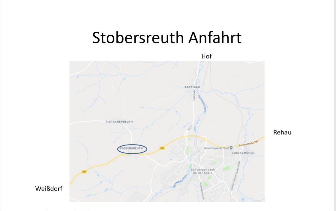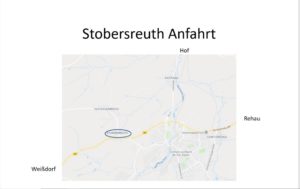 Anfahrt von Triebel in Richtung Regnitzlosau bis A93 - Auffahrt Richtung Nürnberg - Ausfahrt Rehau Süd - auf der B289 über Schwarzenbach bis Abzweig Stobersreuth