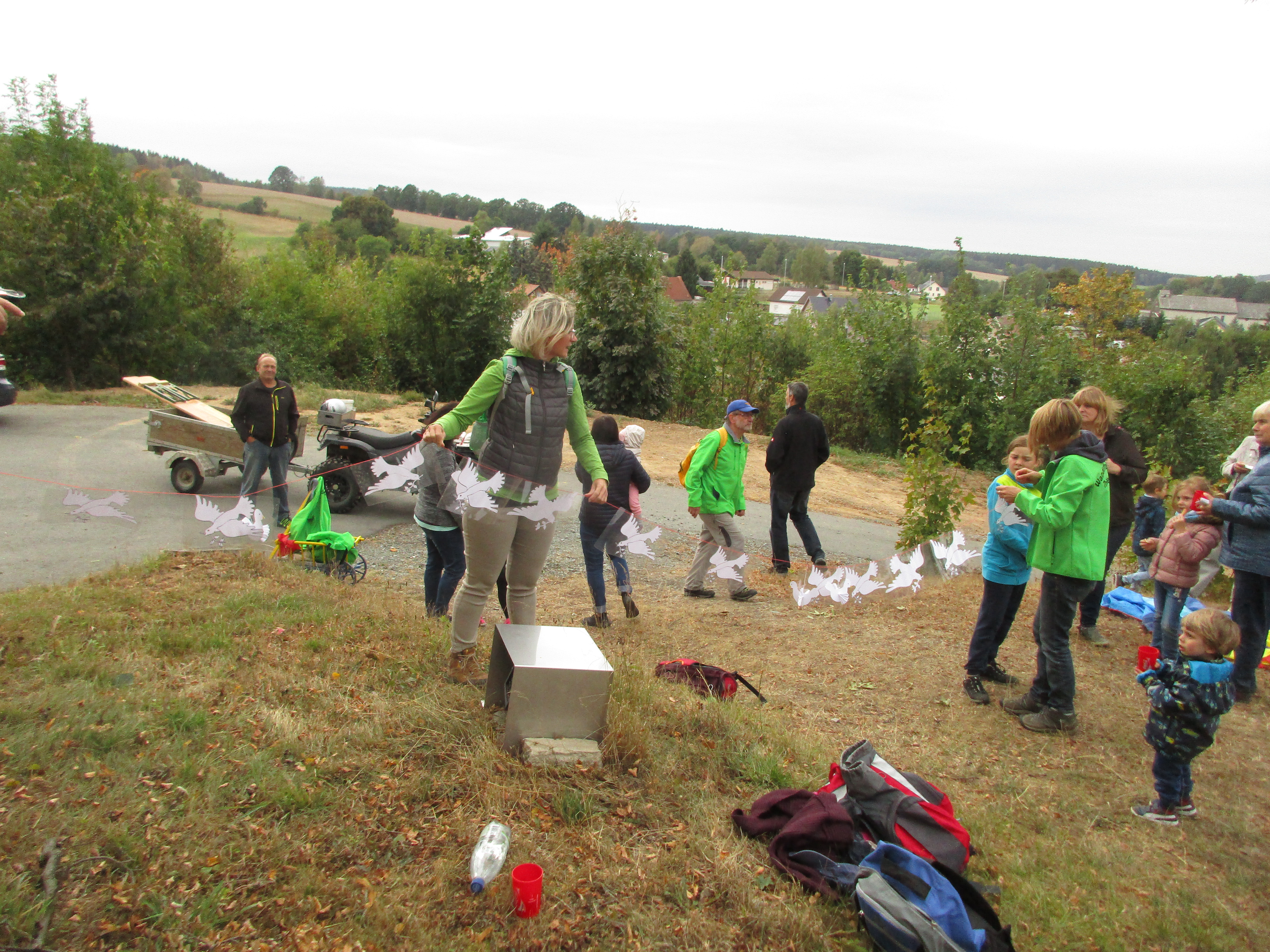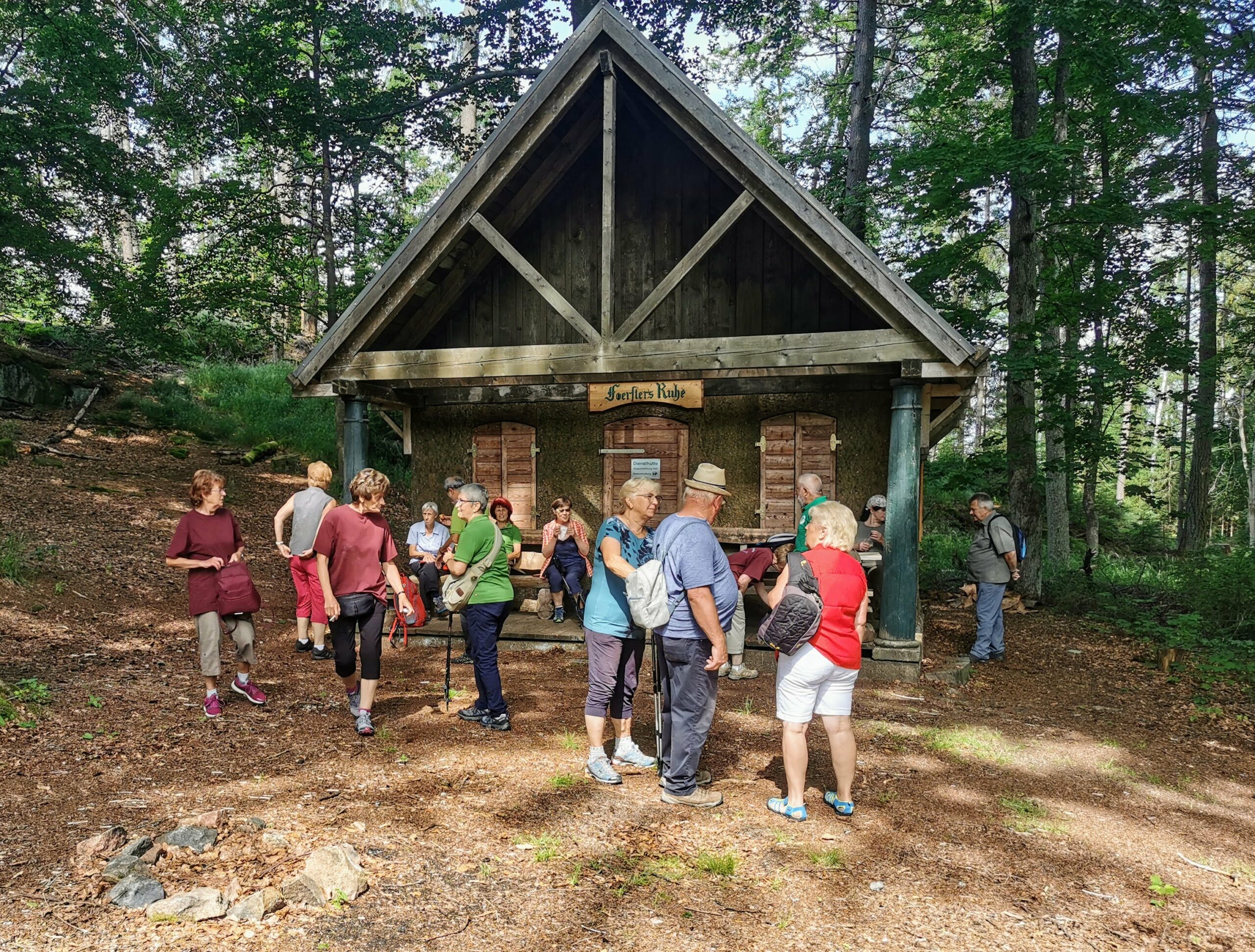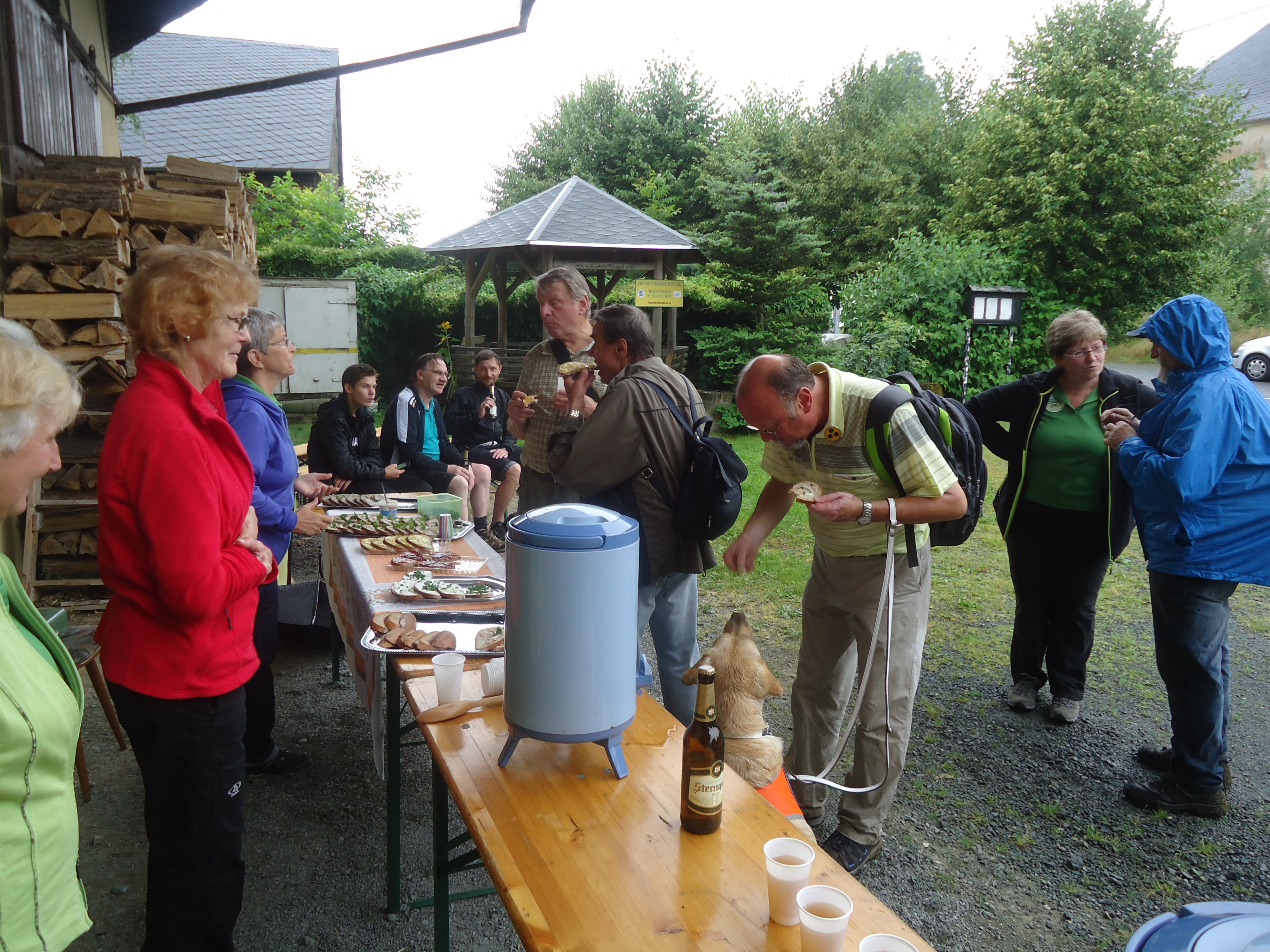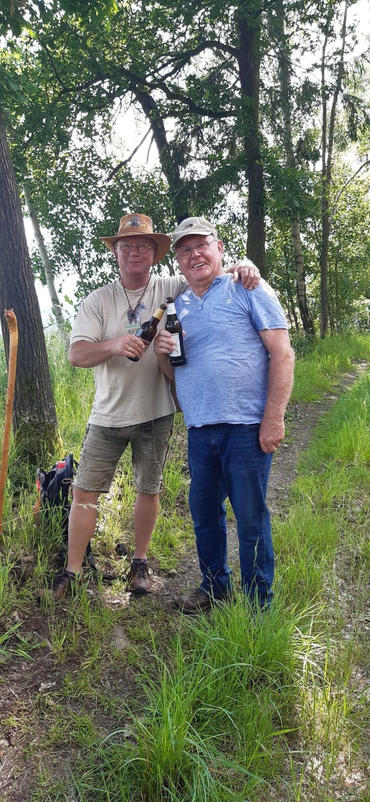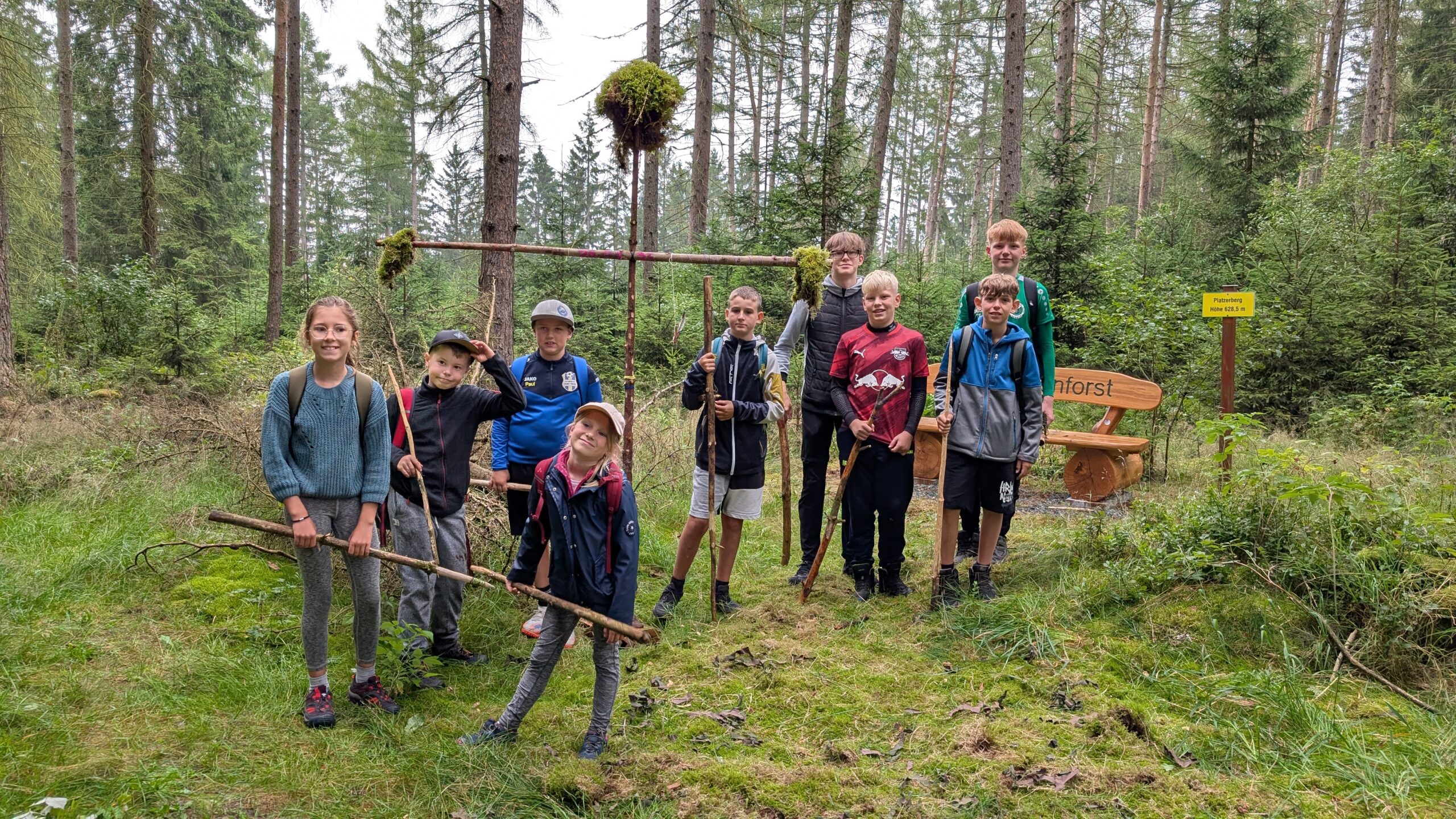Mit Start am Sportplatz wanderten wir über den Steinmauerweg zum Rastplatz an der Kastanie, wo wir Schutz vor einem kurzen Schauer fanden und uns für den folgenden Aufstieg auf den Platzerberg stärkten. Kurzentschlossen machten wir es uns zur Aufgabe, auf der höchsten Erhebung der Gemeinde Triebel ein Gipfelkreuz zu errichten. Mit Säge und Schnitzmesser wurde hier schon kräftig gewerkelt, gemeinsam angepackt und gelacht. Vielleicht hat zukünftig der ein oder andere Kammwegwanderer Freude an unserer einzigartigen Konstruktion.