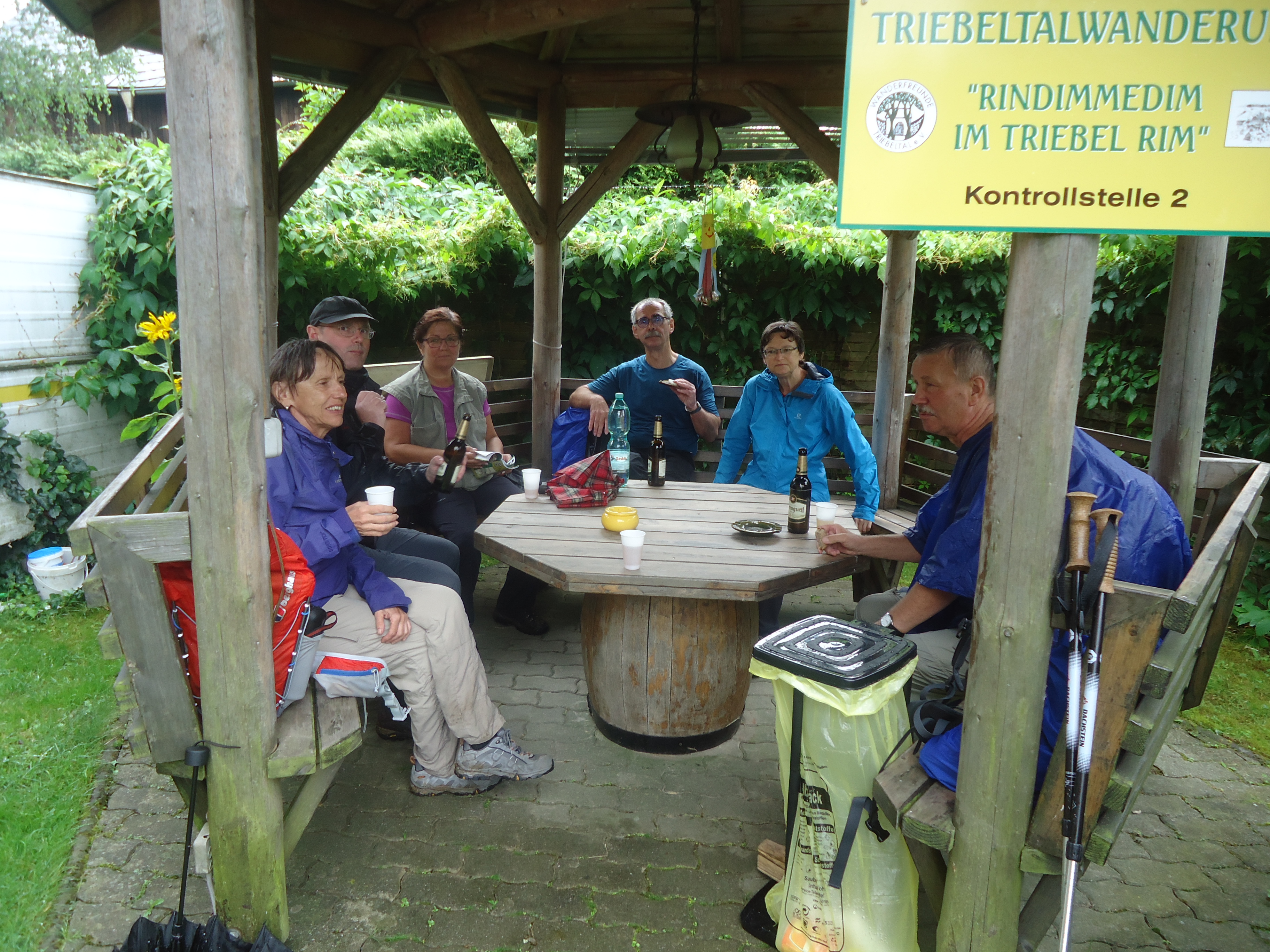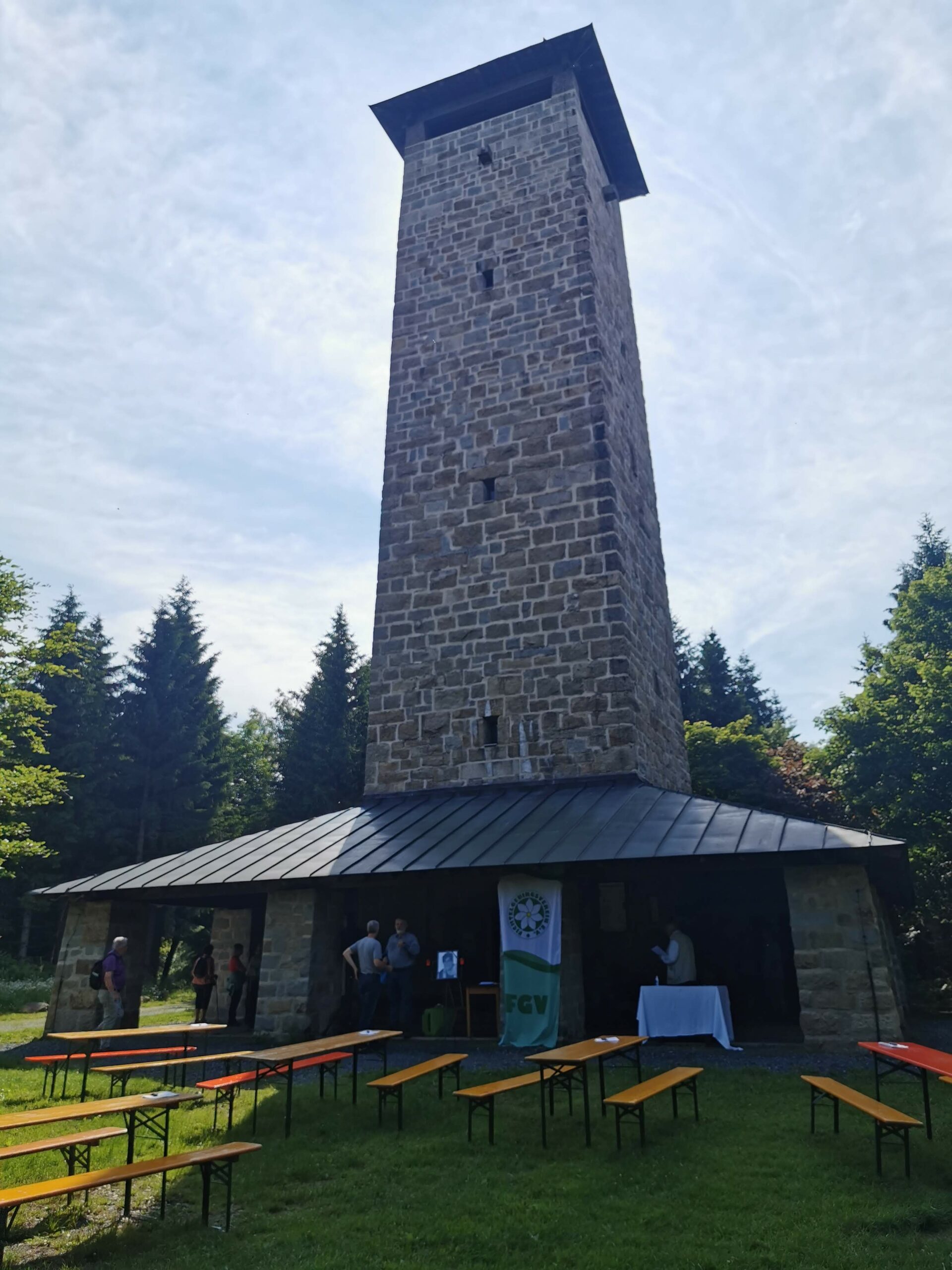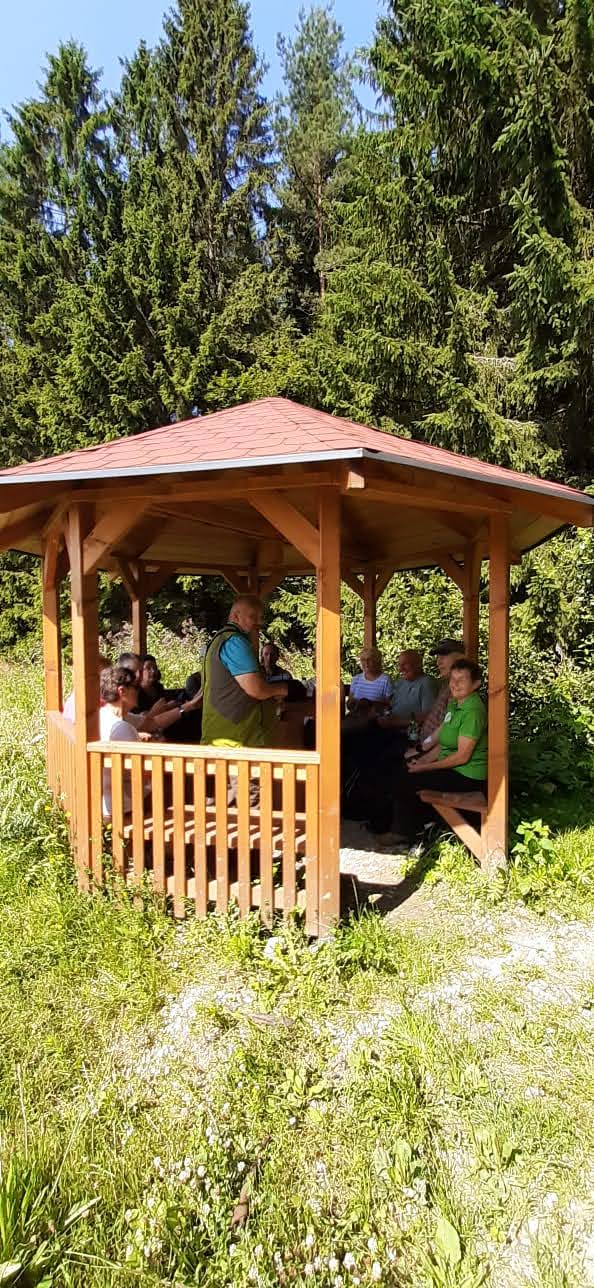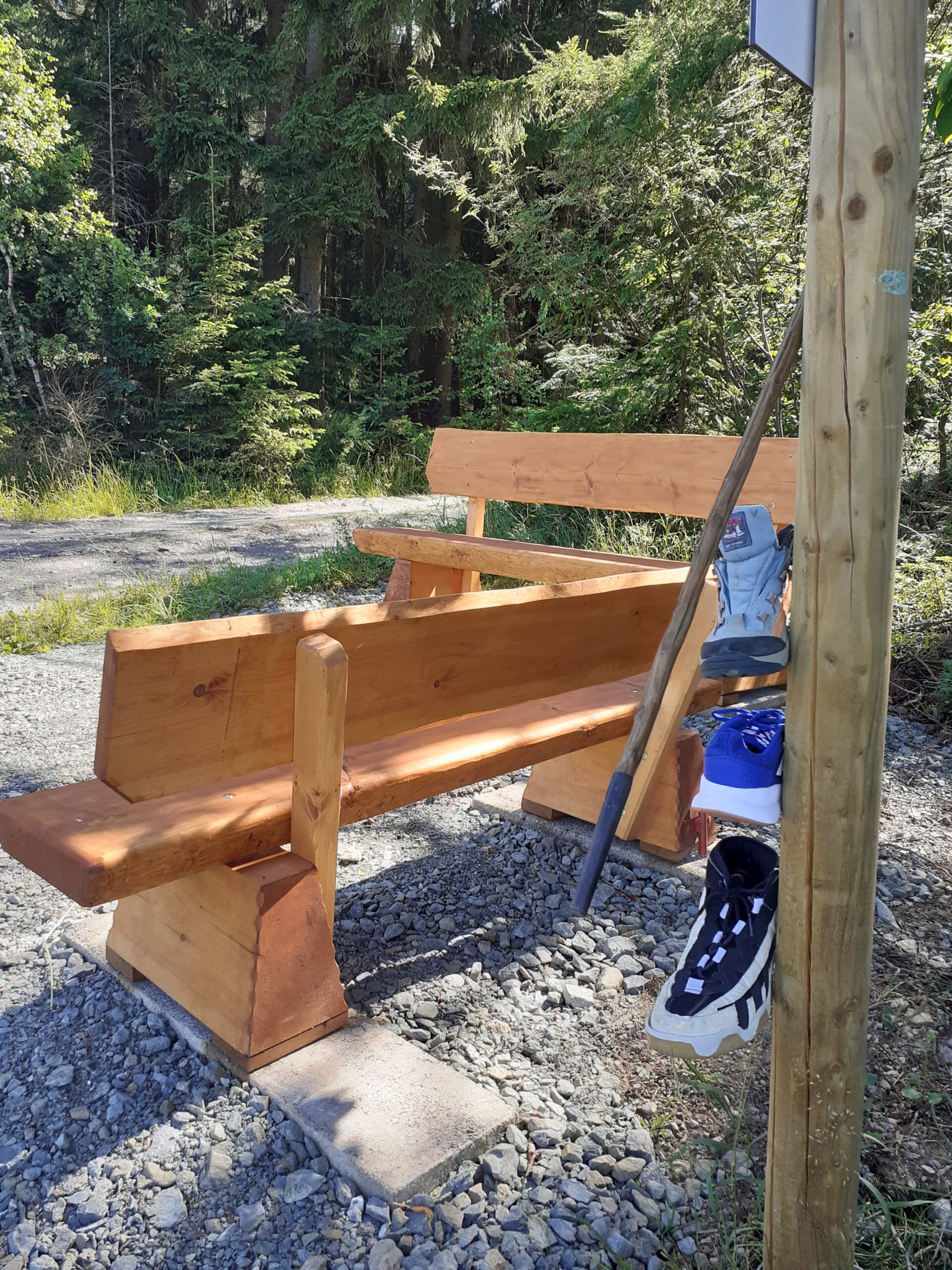 Mit Start am Sportplatz wanderten wir über den Steinmauerweg zum Rastplatz an der Kastanie, wo wir Schutz vor einem kurzen Schauer fanden und uns für den folgenden Aufstieg auf den Platzerberg stärkten. Kurzentschlossen machten wir es uns zur Aufgabe, auf der höchsten Erhebung der Gemeinde Triebel ein Gipfelkreuz zu errichten. Mit Säge und Schnitzmesser wurde hier schon kräftig gewerkelt, gemeinsam angepackt und gelacht. Vielleicht hat zukünftig der ein oder andere Kammwegwanderer Freude an unserer einzigartigen Konstruktion.