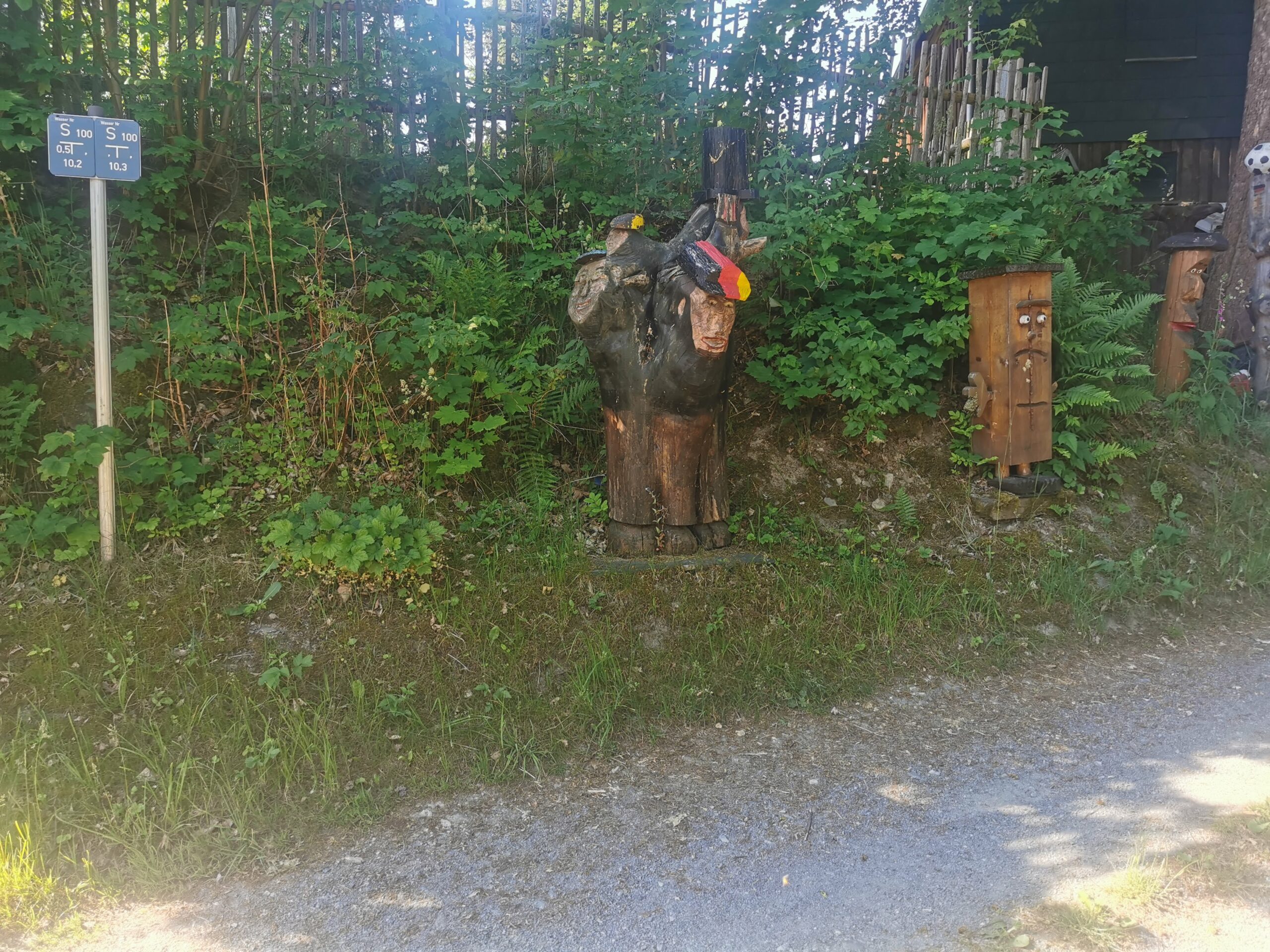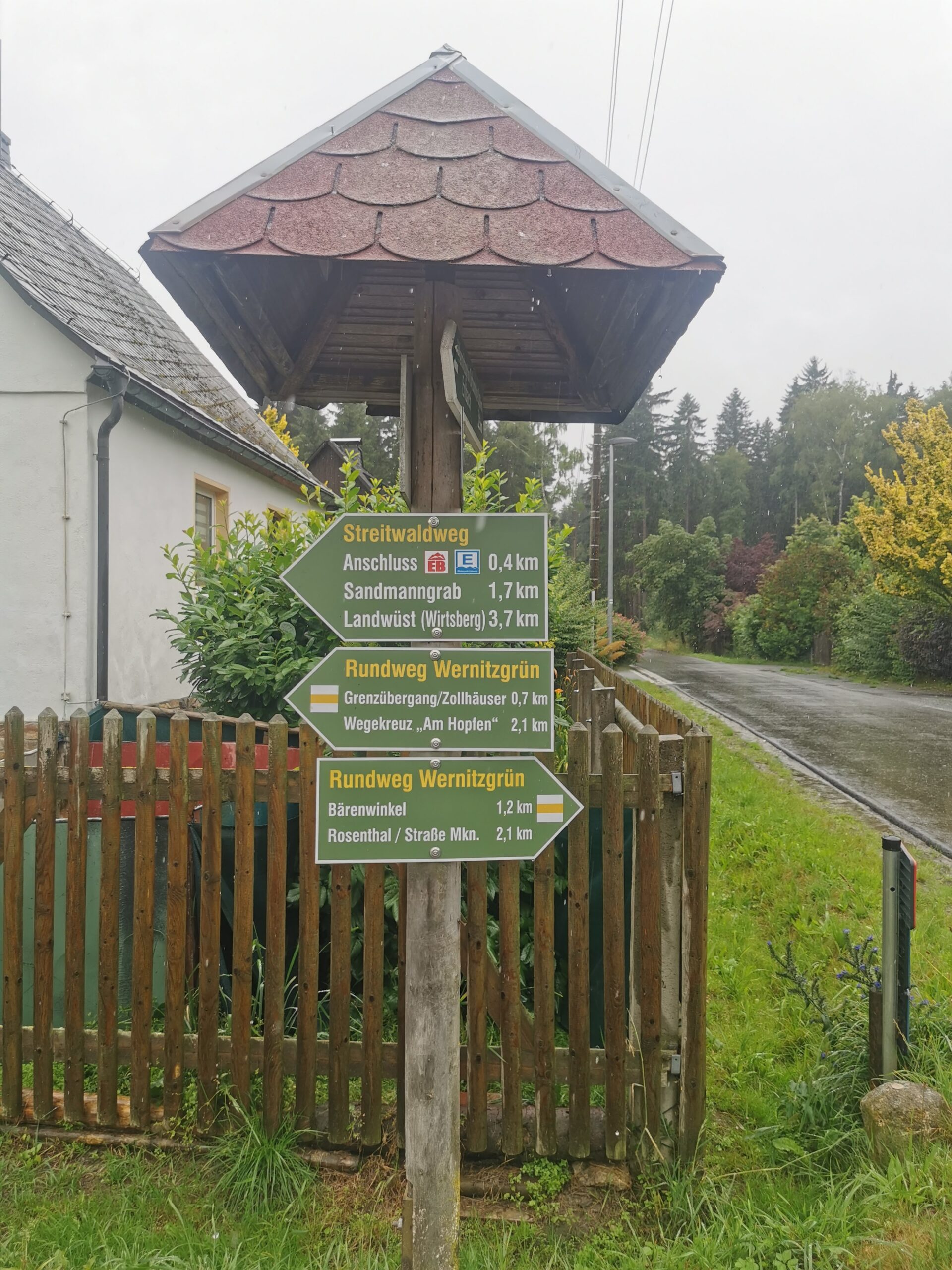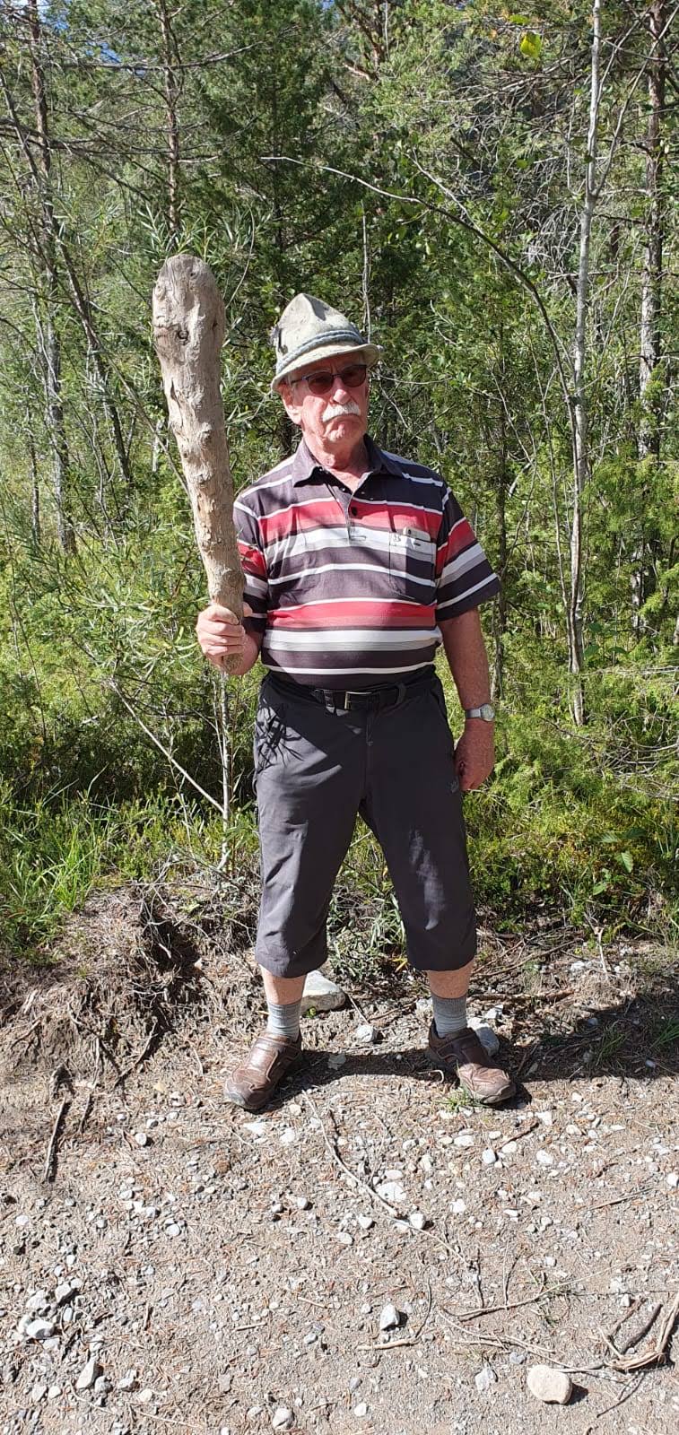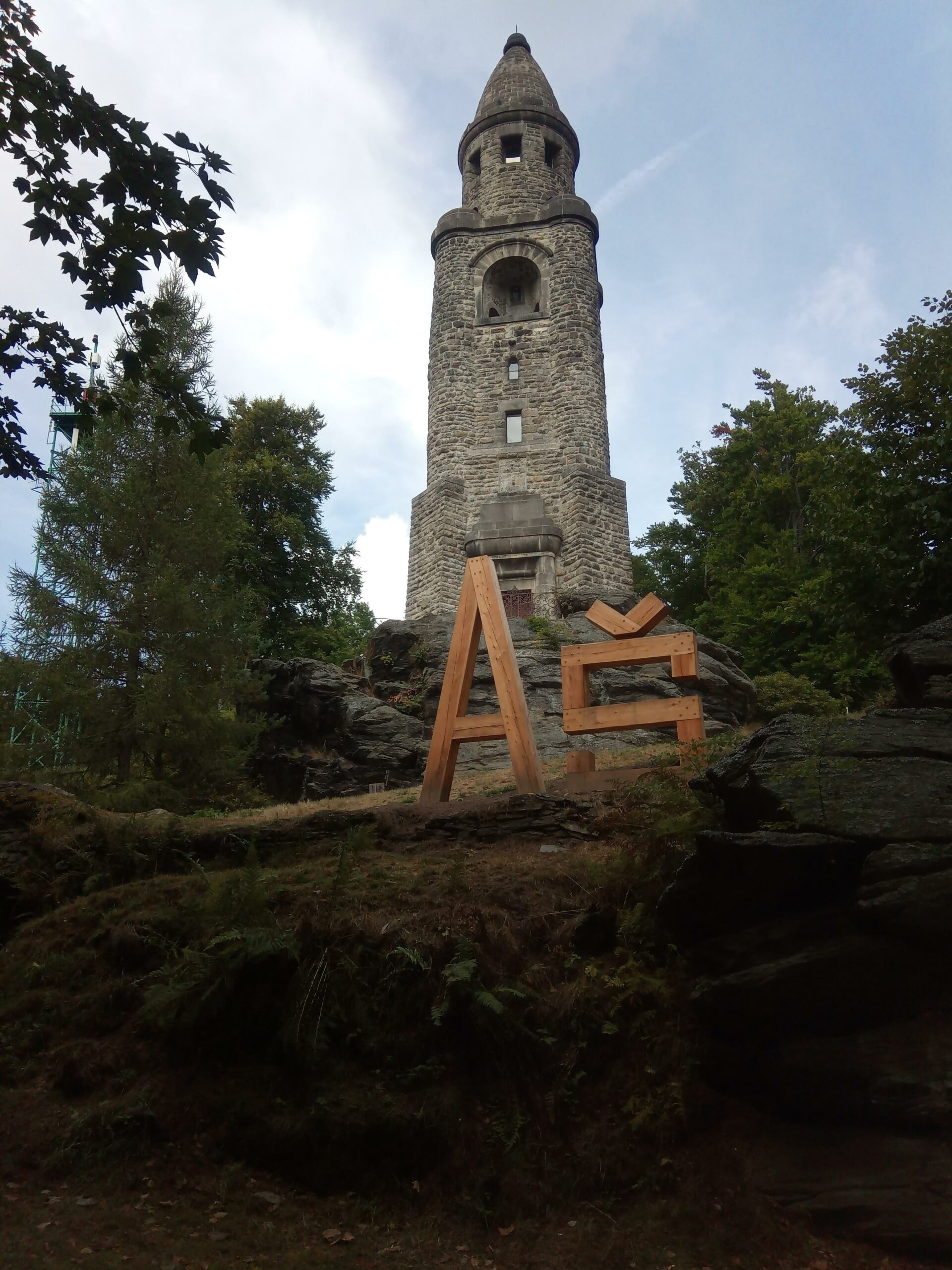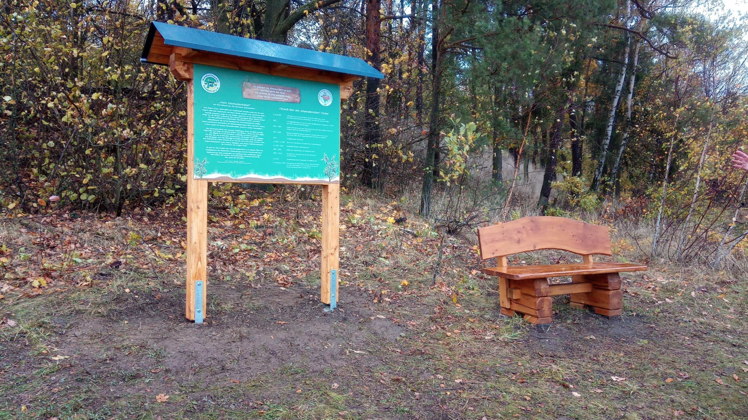 Mit Start am Sportplatz wanderten wir über den Steinmauerweg zum Rastplatz an der Kastanie, wo wir Schutz vor einem kurzen Schauer fanden und uns für den folgenden Aufstieg auf den Platzerberg stärkten. Kurzentschlossen machten wir es uns zur Aufgabe, auf der höchsten Erhebung der Gemeinde Triebel ein Gipfelkreuz zu errichten. Mit Säge und Schnitzmesser wurde hier schon kräftig gewerkelt, gemeinsam angepackt und gelacht. Vielleicht hat zukünftig der ein oder andere Kammwegwanderer Freude an unserer einzigartigen Konstruktion.