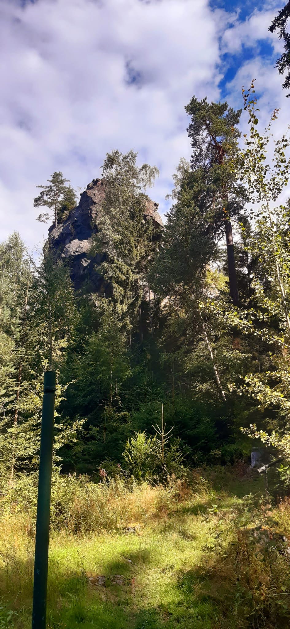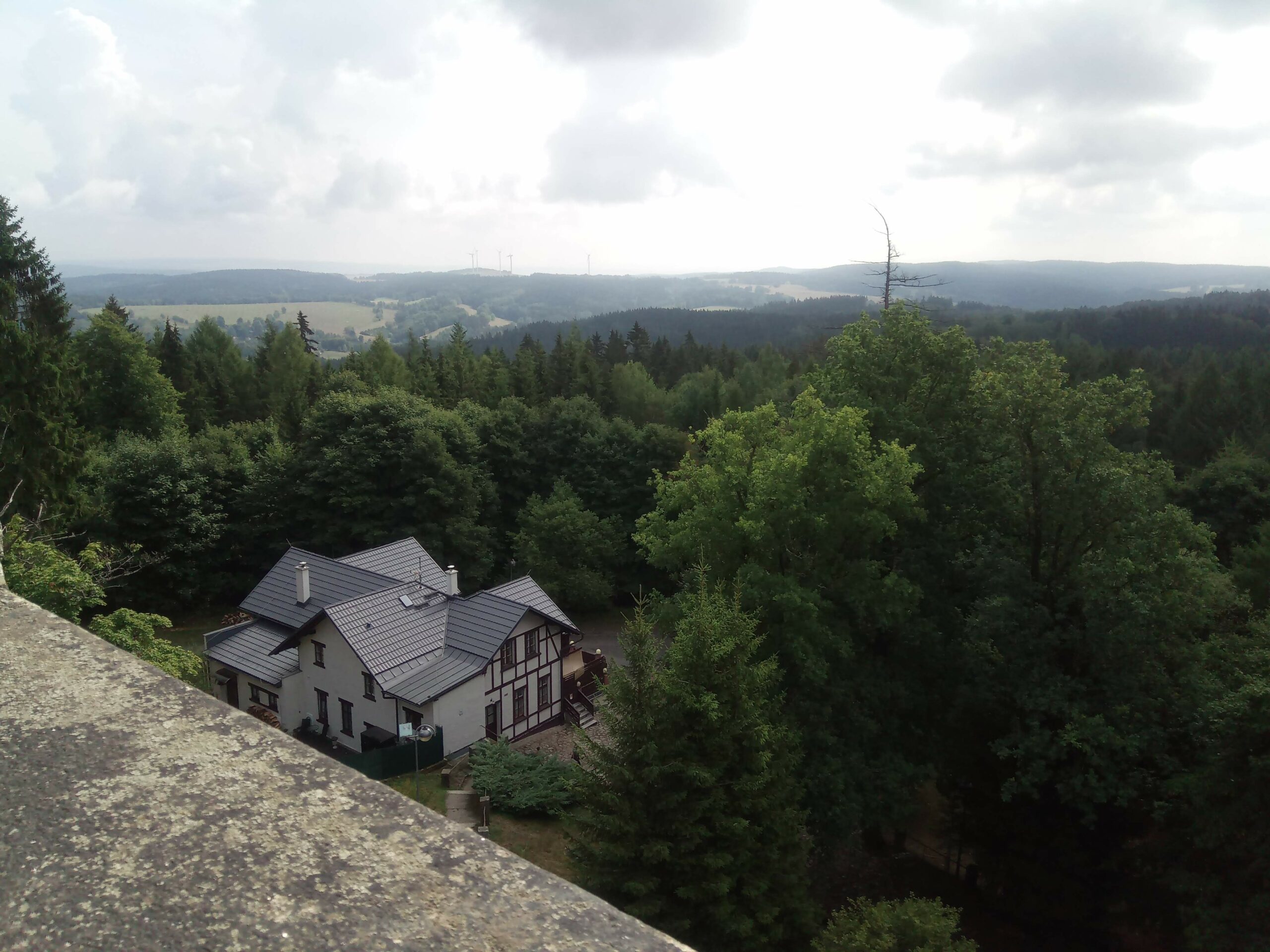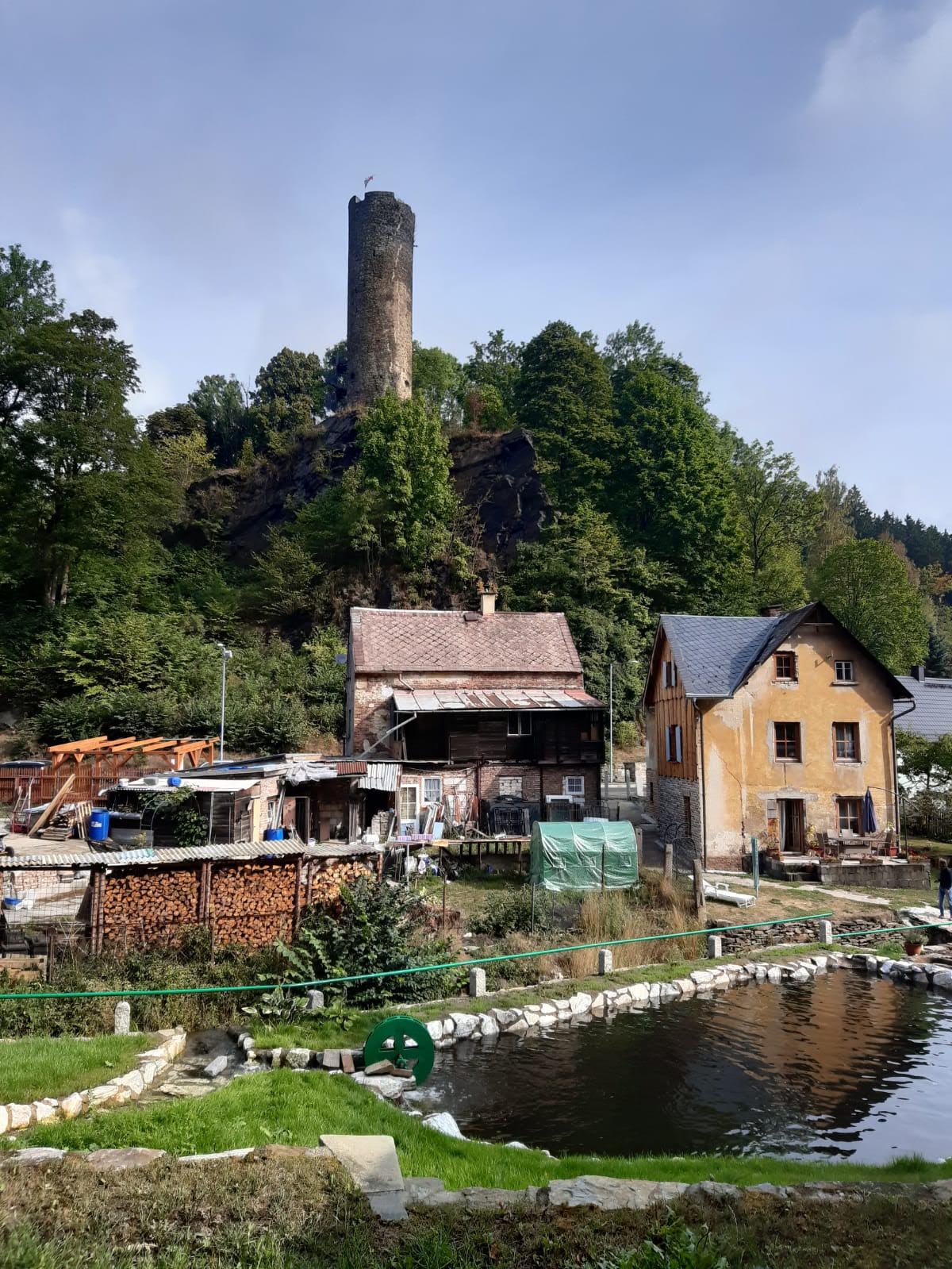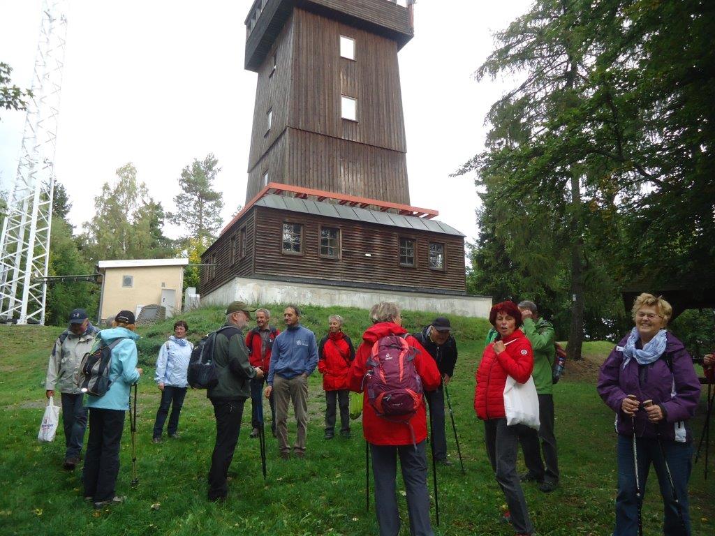 Im kleinen Magazin neben der Unterkunft wurden schnell noch Getränke, Hörnchen und Knacker gekauft. Nun folgte der kurze Aufstieg auf den Hutberg. Auf dem Gipfel findet man eine kleine Aussichtskuppel die eher einer Mondlandekapsel ähnelt als einem Aussichtsturm. Jedenfalls bot sich von hier ein herrlicher Blick in alle Himmelsrichtungen. Direkt südlich erhebt sich der Rosenberg und der Kaltenberg, im Westen der Hohe Schneeberg. Im Norden konnten wir die Steine der Sächsischen Schweiz aus machen, und im Osten grüßen die Berge des Zittauer Gebirges. Wir folgten dem Verlauf des alten Kammweges, der uns nun in die Ferdinandsklamm führte, vorbei an den Ruinen der Grundmühle, deren Geschichte bis ins 16. Jhd. zurück geht. Unvorstellbar, was hier früher für ein Aufwand betrieben wurde, um Getreide zu mahlen, Schnaps zu brennen, die Kahnfahrt aufrecht zu erhalten und sogar eine Gärtnerei zu betreiben. Im Hohlen Stein in Schemmel fanden wir glücklicherweise Schutz vor einem Regenschauer. Auf dem letzten Kilometer vor Dittersbach wurden wir dann aber doch noch nass.