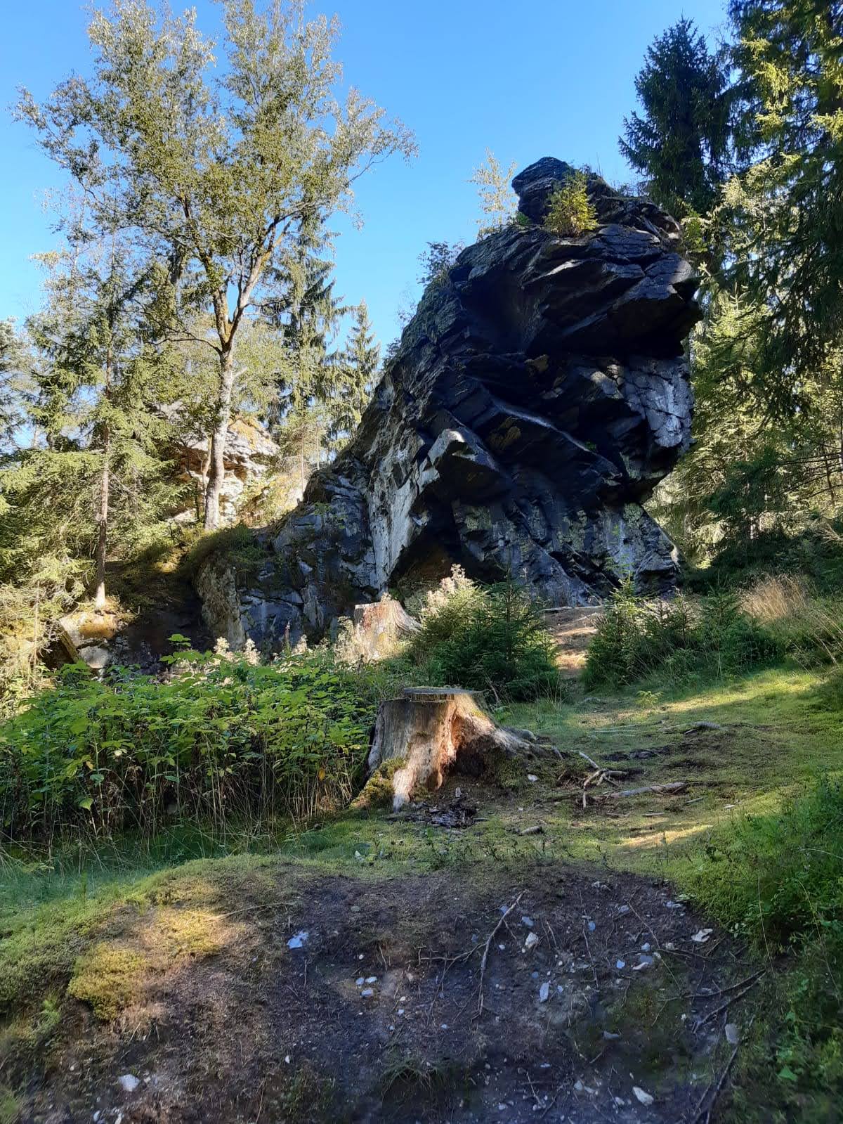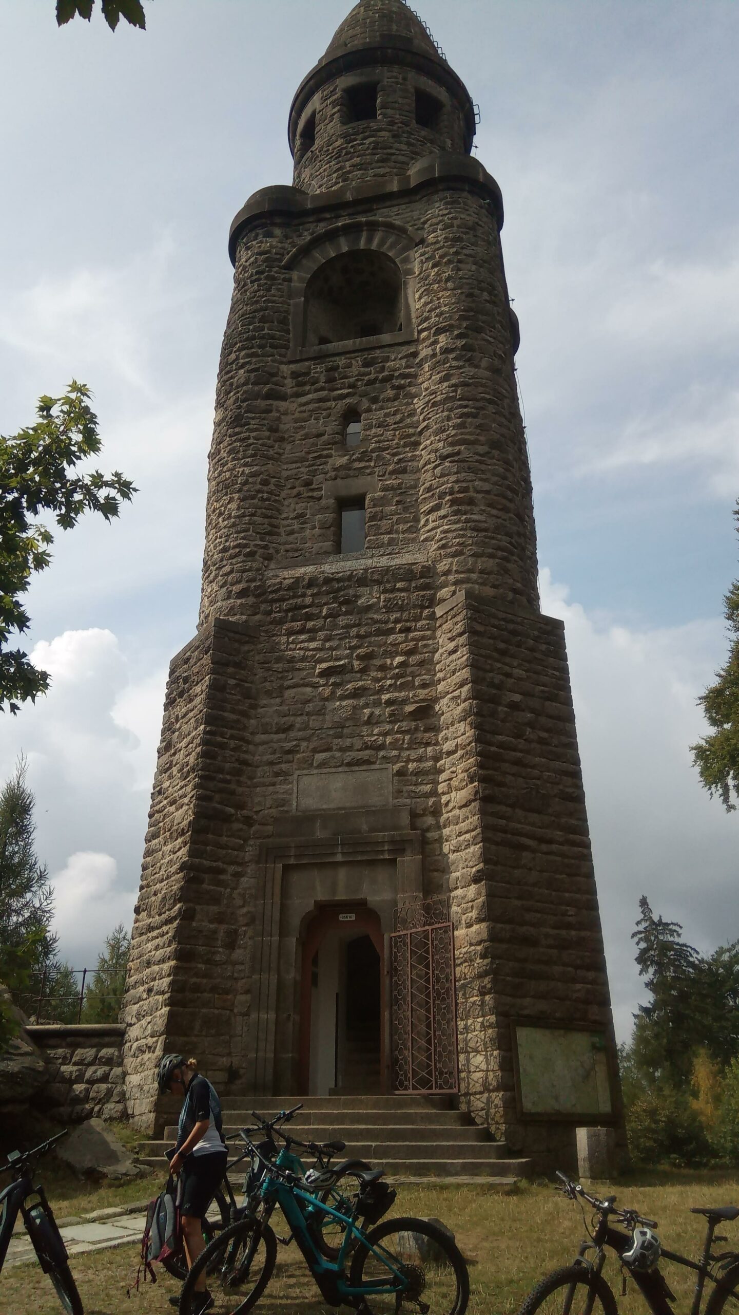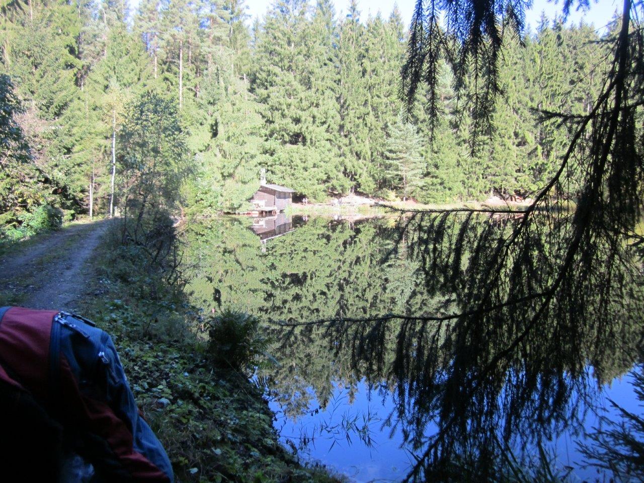 Im kleinen Magazin neben der Unterkunft wurden schnell noch Getränke, Hörnchen und Knacker gekauft. Nun folgte der kurze Aufstieg auf den Hutberg. Auf dem Gipfel findet man eine kleine Aussichtskuppel die eher einer Mondlandekapsel ähnelt als einem Aussichtsturm. Jedenfalls bot sich von hier ein herrlicher Blick in alle Himmelsrichtungen. Direkt südlich erhebt sich der Rosenberg und der Kaltenberg, im Westen der Hohe Schneeberg. Im Norden konnten wir die Steine der Sächsischen Schweiz aus machen, und im Osten grüßen die Berge des Zittauer Gebirges. Wir folgten dem Verlauf des alten Kammweges, der uns nun in die Ferdinandsklamm führte, vorbei an den Ruinen der Grundmühle, deren Geschichte bis ins 16. Jhd. zurück geht. Unvorstellbar, was hier früher für ein Aufwand betrieben wurde, um Getreide zu mahlen, Schnaps zu brennen, die Kahnfahrt aufrecht zu erhalten und sogar eine Gärtnerei zu betreiben. Im Hohlen Stein in Schemmel fanden wir glücklicherweise Schutz vor einem Regenschauer. Auf dem letzten Kilometer vor Dittersbach wurden wir dann aber doch noch nass.
