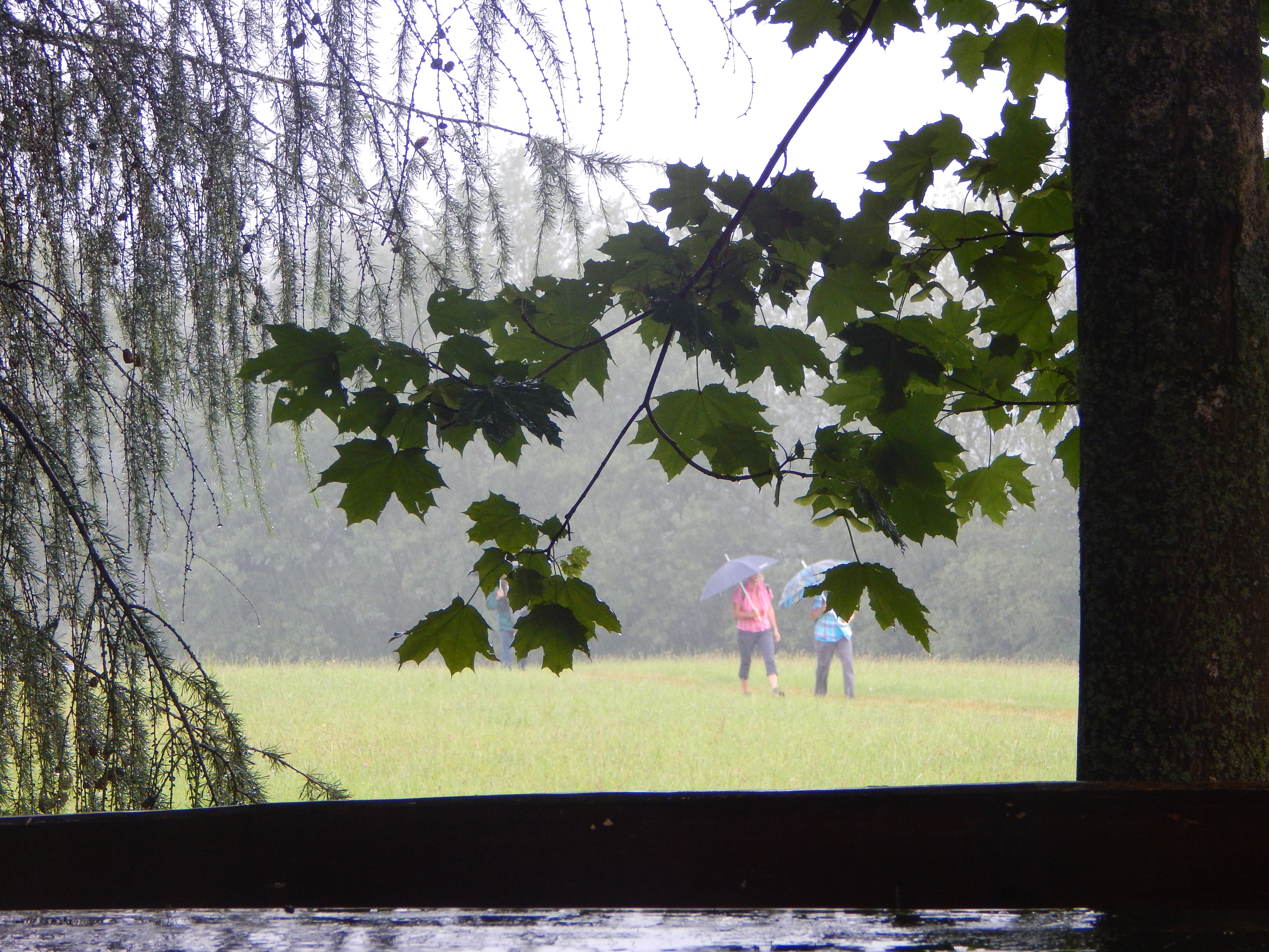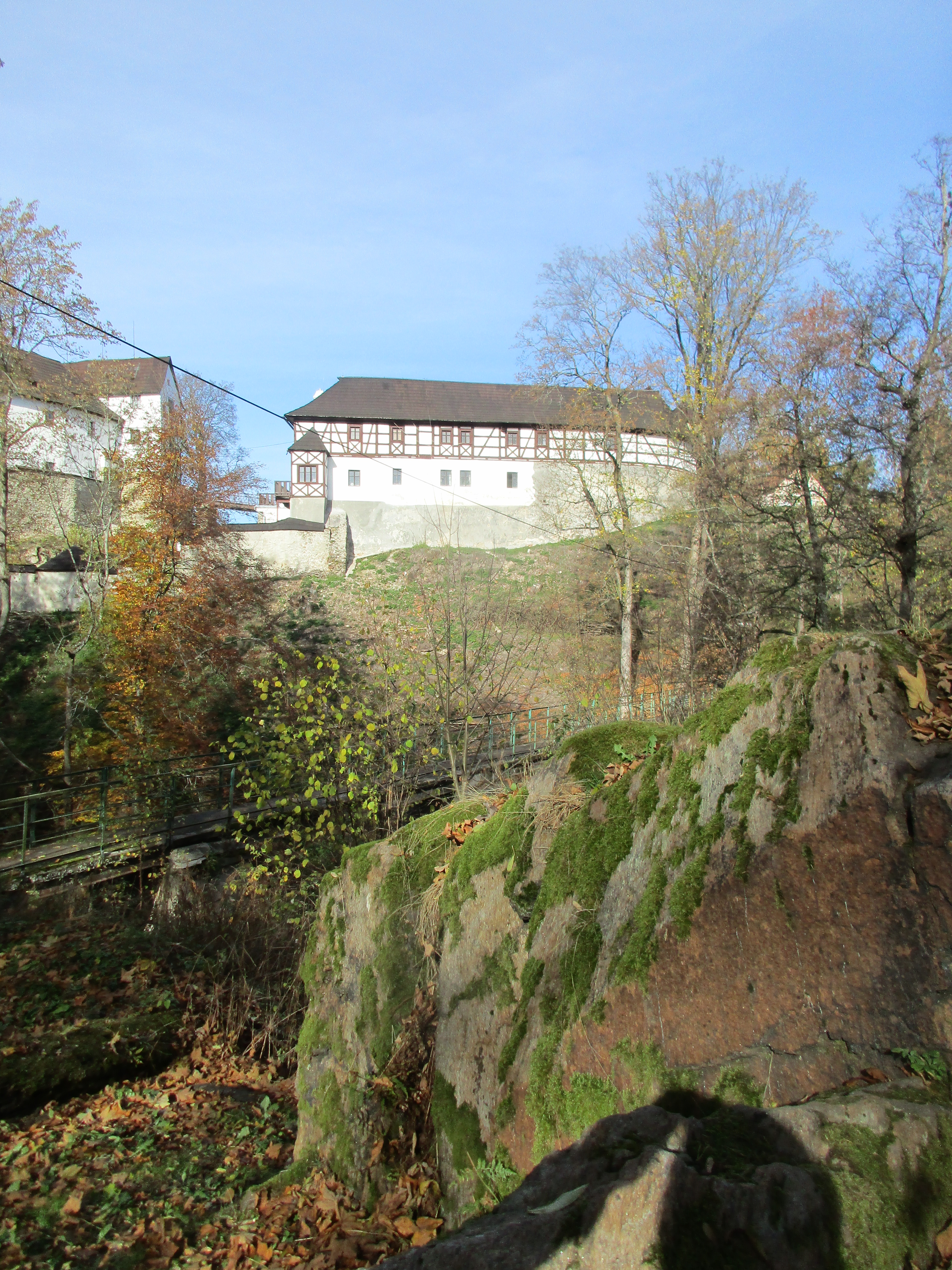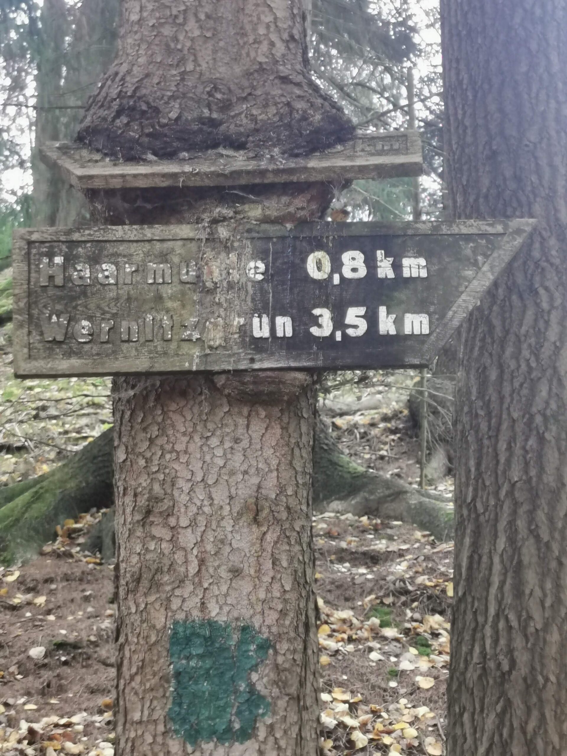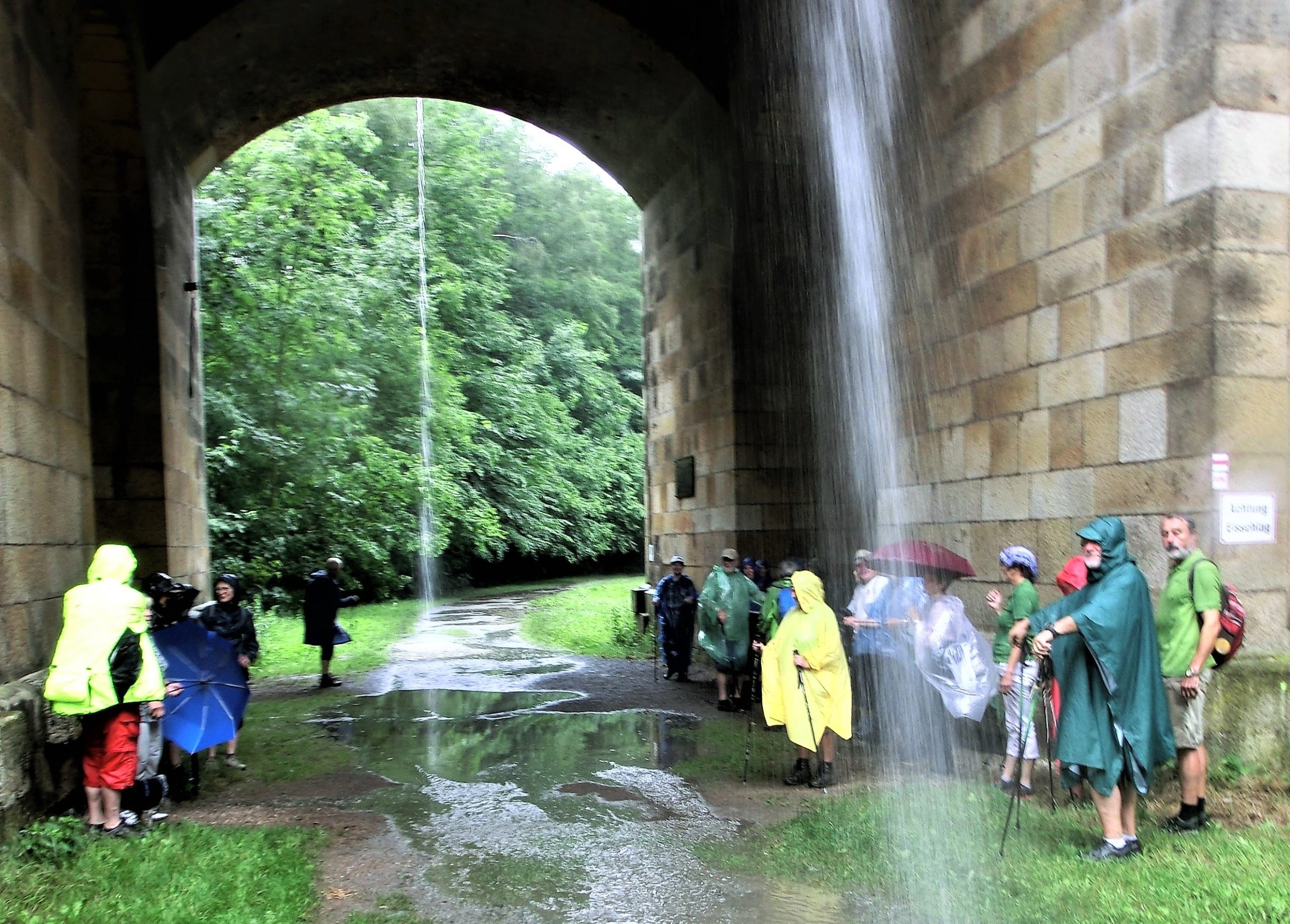 Im kleinen Magazin neben der Unterkunft wurden schnell noch Getränke, Hörnchen und Knacker gekauft. Nun folgte der kurze Aufstieg auf den Hutberg. Auf dem Gipfel findet man eine kleine Aussichtskuppel die eher einer Mondlandekapsel ähnelt als einem Aussichtsturm. Jedenfalls bot sich von hier ein herrlicher Blick in alle Himmelsrichtungen. Direkt südlich erhebt sich der Rosenberg und der Kaltenberg, im Westen der Hohe Schneeberg. Im Norden konnten wir die Steine der Sächsischen Schweiz aus machen, und im Osten grüßen die Berge des Zittauer Gebirges. Wir folgten dem Verlauf des alten Kammweges, der uns nun in die Ferdinandsklamm führte, vorbei an den Ruinen der Grundmühle, deren Geschichte bis ins 16. Jhd. zurück geht. Unvorstellbar, was hier früher für ein Aufwand betrieben wurde, um Getreide zu mahlen, Schnaps zu brennen, die Kahnfahrt aufrecht zu erhalten und sogar eine Gärtnerei zu betreiben. Im Hohlen Stein in Schemmel fanden wir glücklicherweise Schutz vor einem Regenschauer. Auf dem letzten Kilometer vor Dittersbach wurden wir dann aber doch noch nass.