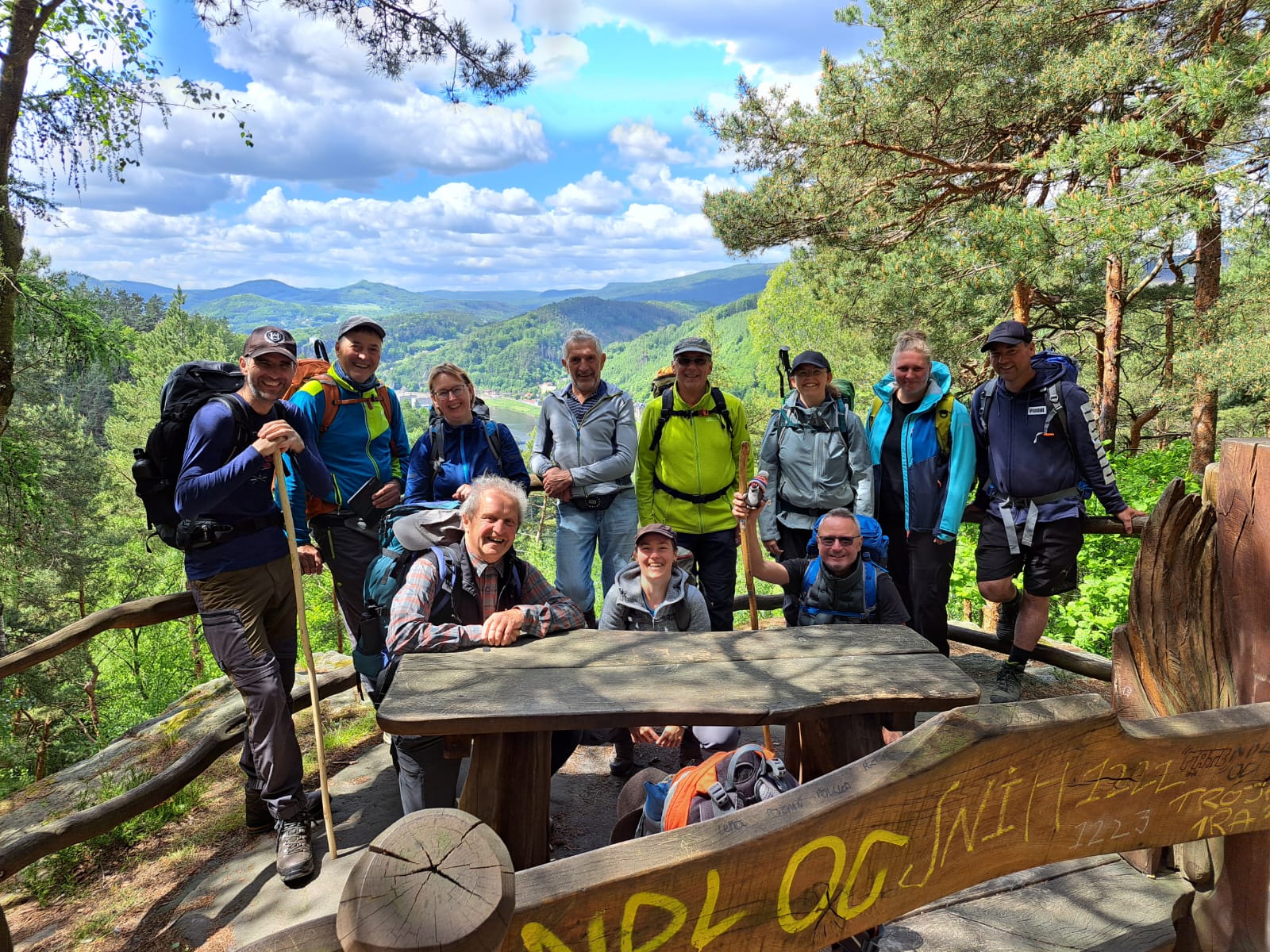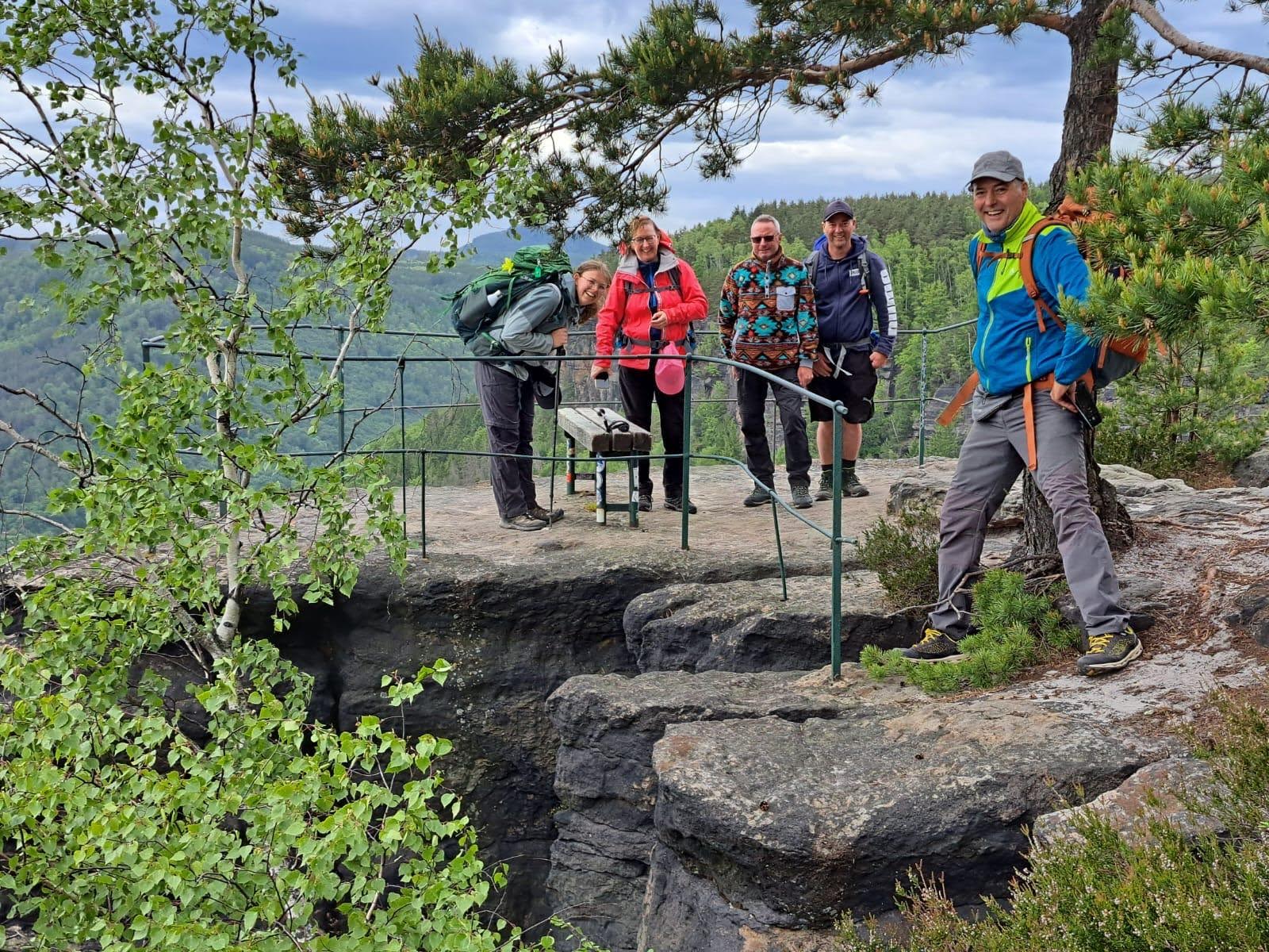 Von der Touristeninformation in Dittersbach, stiegen wir recht zügig auf zum Marienfels. Von diesem, auf einer Felsnadel, gelegenen Aussichtspavillon hat man eine traumhafte Aussicht auf die Umgebung. Weitere Highlights auf der Tour waren die Balzerhöhle, der Aussichtspunkt auf der Wilhelminenwand und der Rudolfstein. Gerade dieser glänzt mit einem spektakulären Aufstieg und einer atemberaubenden Aussicht. Nach einem Böhmischen Kaltgetränk im Hegerhaus folgte der Rückweg nach Dittersbach. Die dicken Regenwolken waren am Ende wieder schneller als wir und zwangen uns noch dazu unsere Ponchos und Regenjacken anzuziehen. Im Gasthof Prag hatten wir für den Abend einen Tisch bestellt. Bei Böhmischen Knödeln und dem ein oder anderen Pils wurde zurückgeblickt auf drei Wunderschöne Wandertage, es wurde viel gelacht und bereits Pläne für eine Mehrtagestour 2026 geschmiedet, die ganz bestimmt einen Platz im Wanderkalender finden wird.