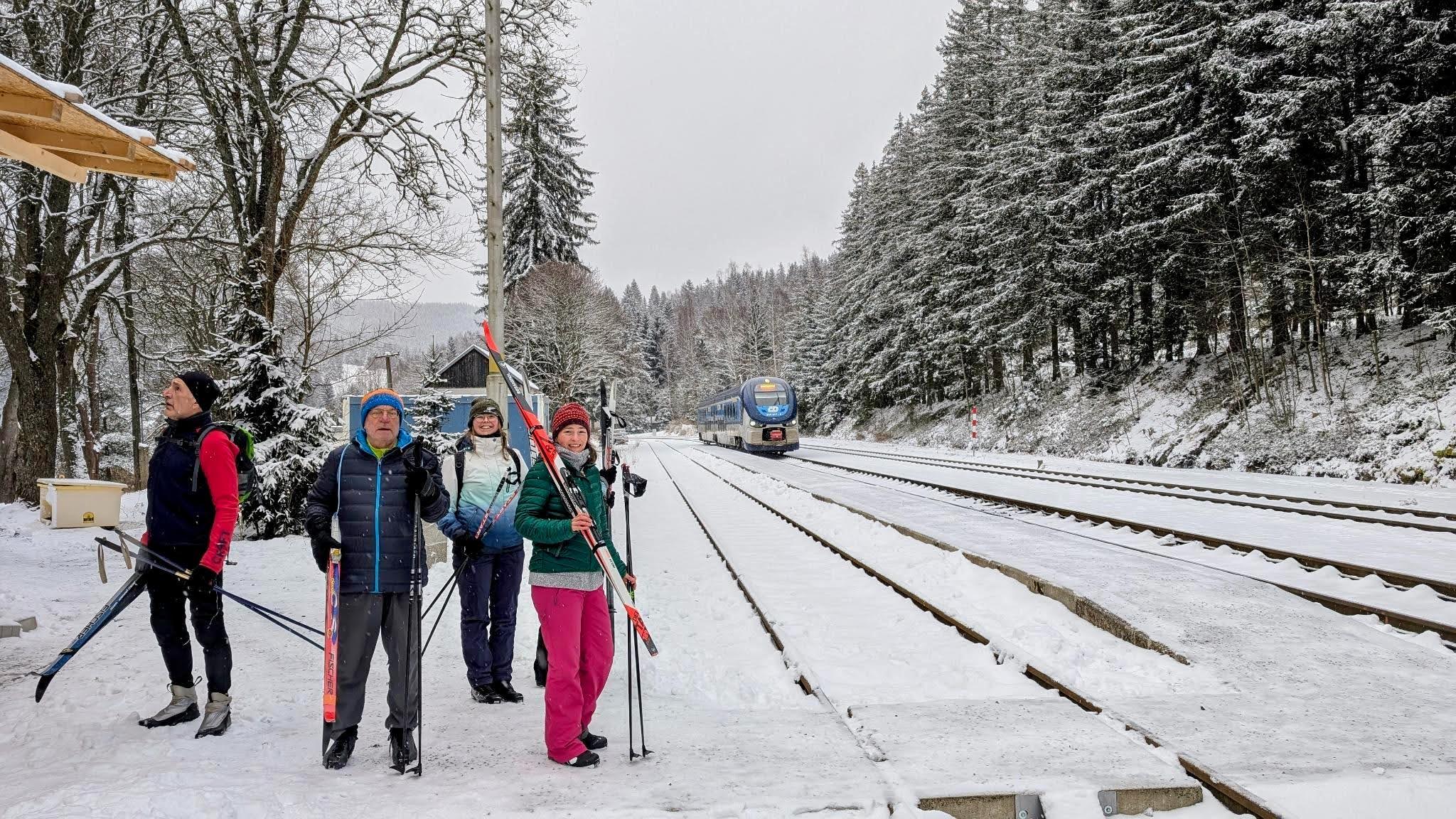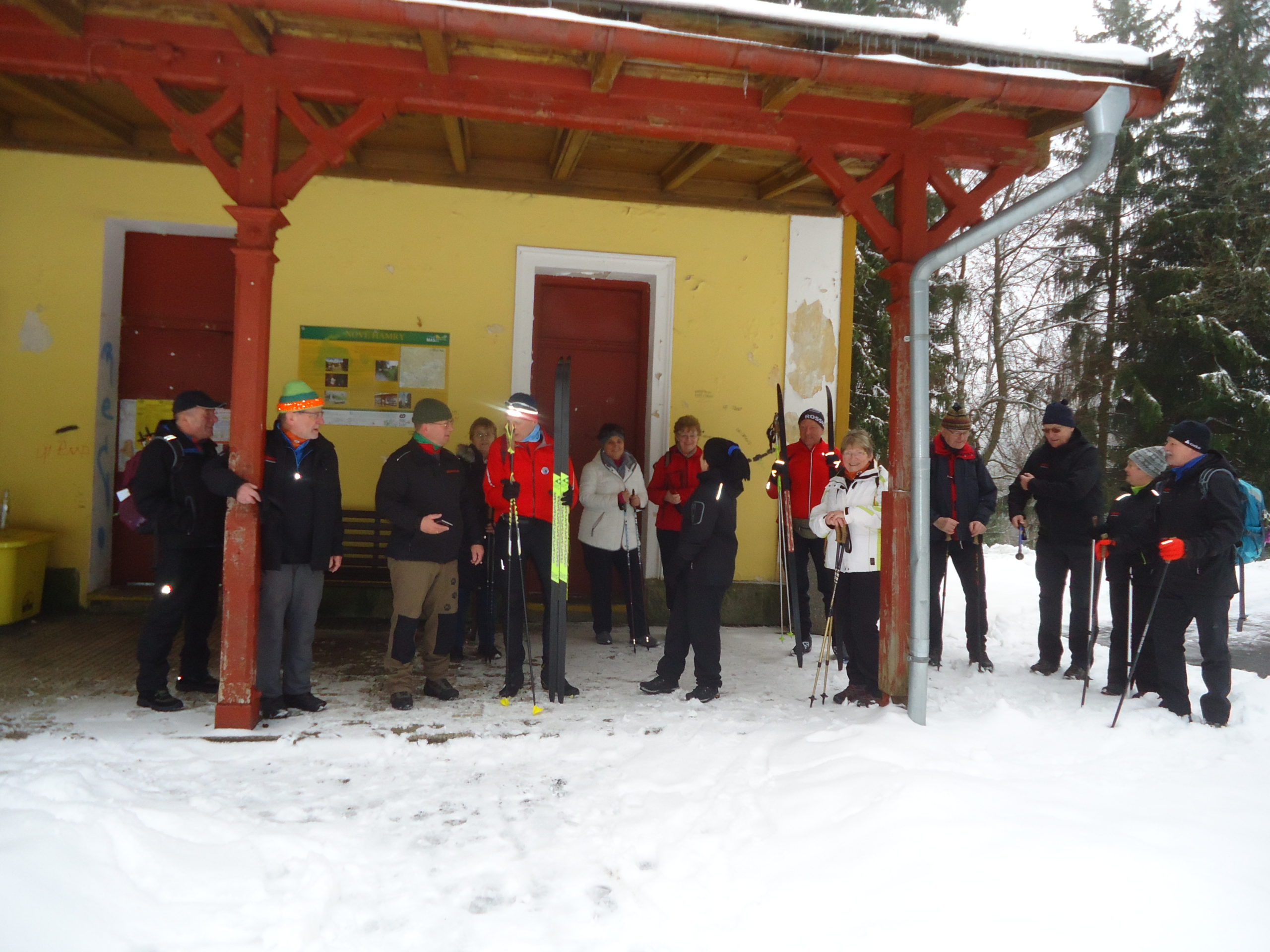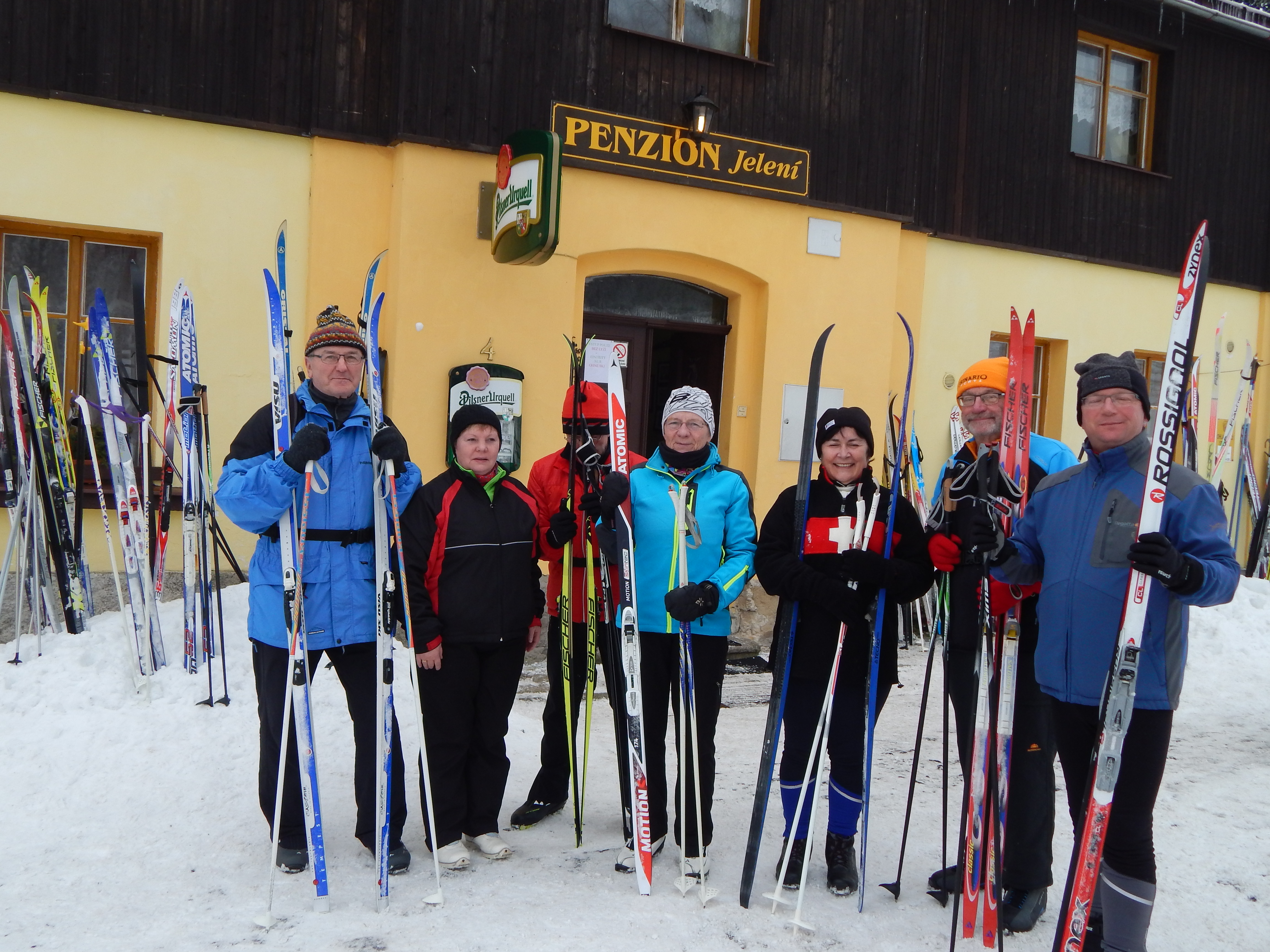 Am Samstagmorgen wurde es ernst: Tief verschneit, mit mindestens 30 cm Neuschnee ohne Frühsport – so präsentierte sich die äußere Lage. Zwei Adorfer fuhren schon nach Hause – da waren wir nur noch 15. Karl-Heinz, Bärbel und ihr befreundetes Paar aus Chemnitz machten sich in Richtung Jeleni auf. Die anderen 11 Skienthusiasten stürzten sich um 10.30 Uhr in den überfüllten Zug nach Horni Platna. Die 3 Adorfer Spezialisten verließen uns schon in Pernink. Da waren`s nur noch 8. Unerschrocken von dem vielen Schnee in den Straßen von Horni Platna und dem kräftigen Schneegestöber, das uns auf dem langen Anstieg hinauf Richtung Plattenberg ins Gesicht blies, ging es weiter Richtung Magistrale. An der Verpflegungshütte Ucervene jamy angekommen, nahmen wir „Flüssigkeiten“ auf, wachsten um und entschieden uns, aufgrund der widrigen Witterungsbedingungen und dem geringen Rutschverhalten (bei Dolores rutschte es am schlechtesten), die geplante Strecke zu verkürzen. Auf der Magistrale ging es hinüber nach Pernink. Nach zwei vergeblichen Versuchen, in einer Gaststätte unter zu kommen, stiefelten wir mit geschulterten Skiern den Berg hinauf zum Nadrasie (Bahnhof). Am Skihang bewunderten wir etwas neidisch die Abfahrtskünste der kleinen Skihasen.