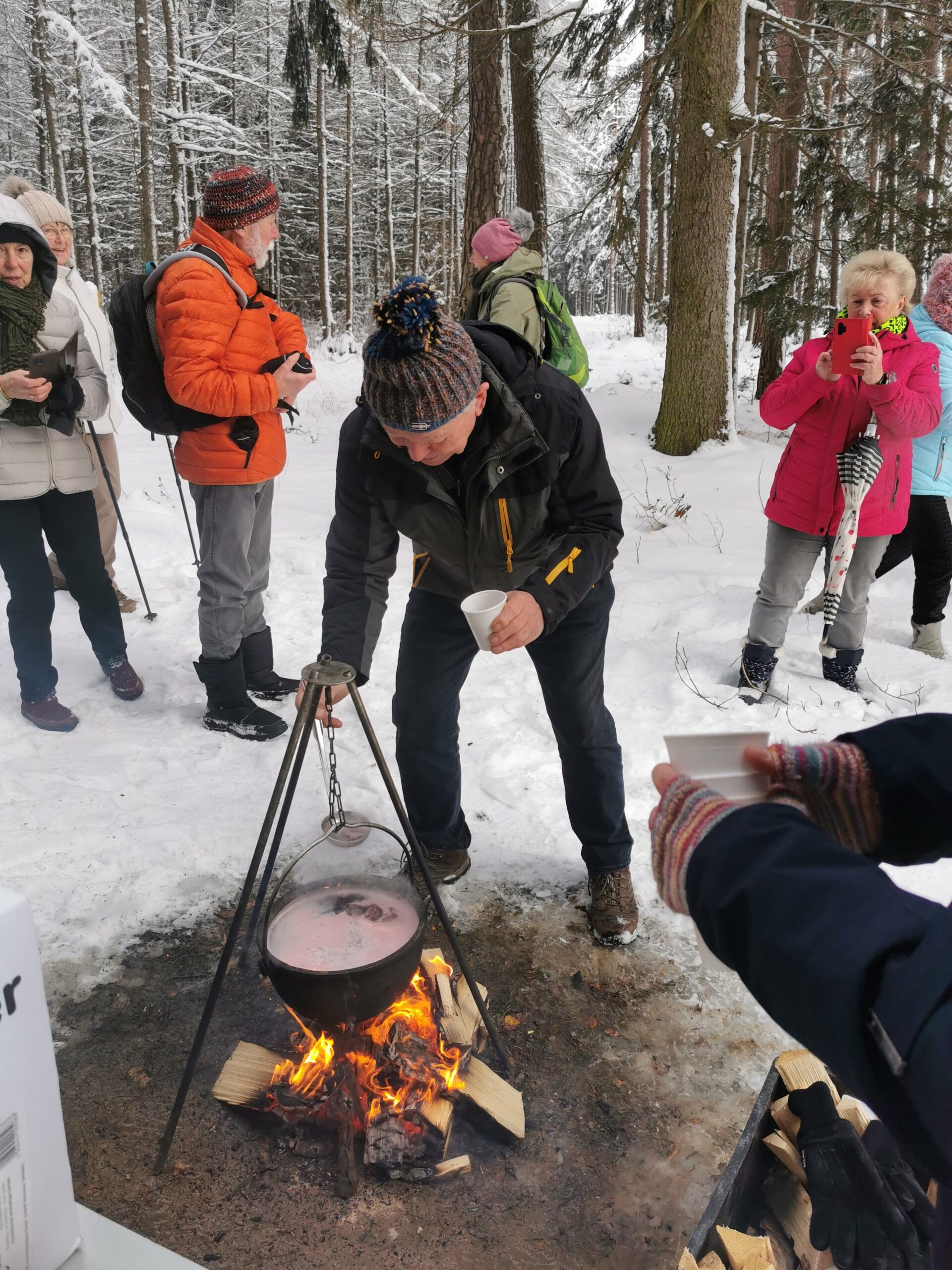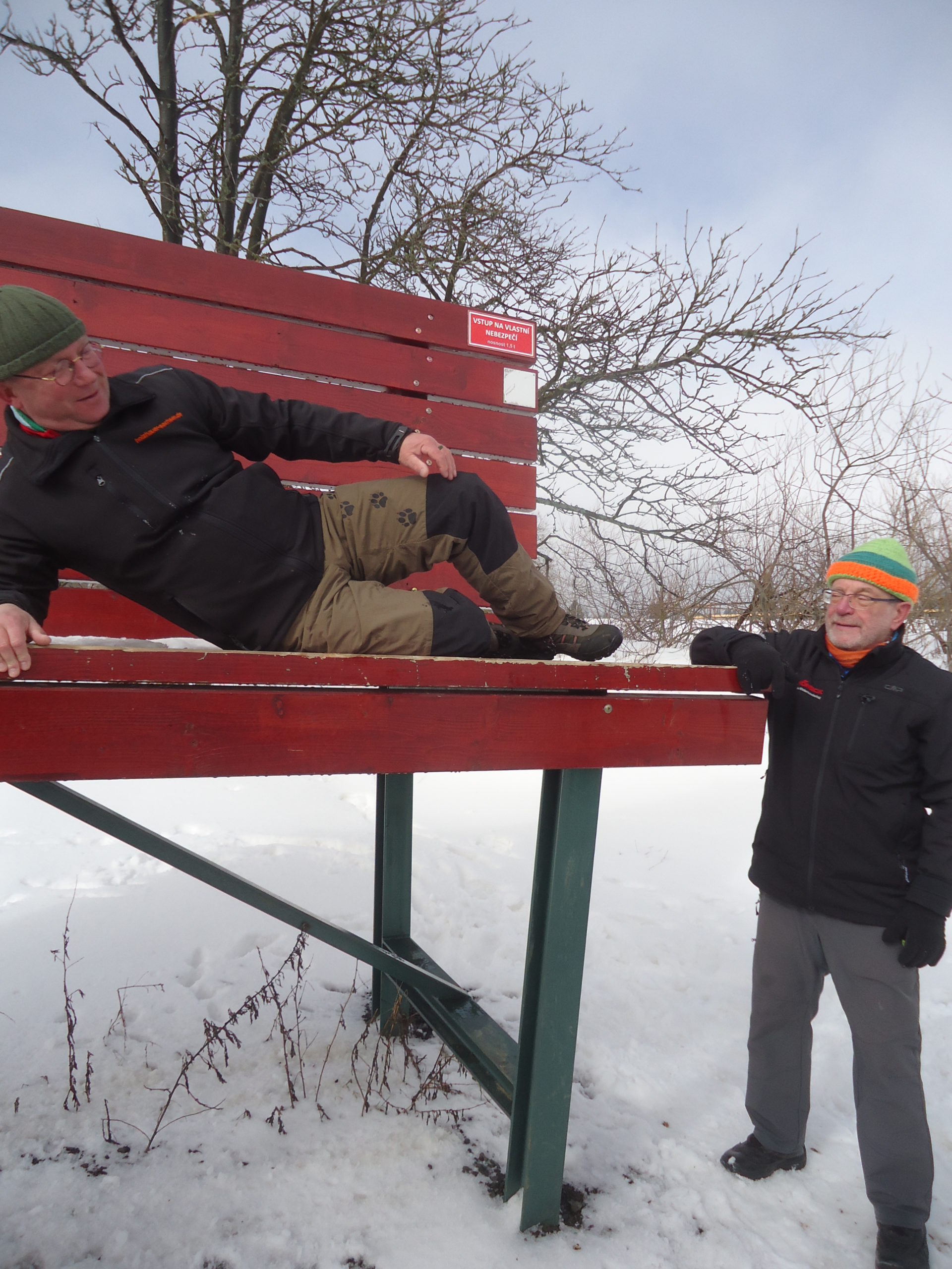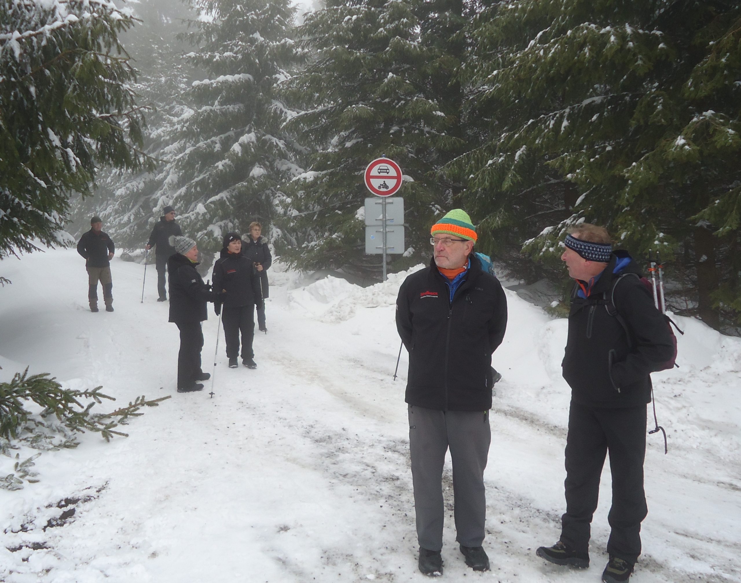Am Samstagmorgen wurde es ernst: Tief verschneit, mit mindestens 30 cm Neuschnee ohne Frühsport – so präsentierte sich die äußere Lage. Zwei Adorfer fuhren schon nach Hause – da waren wir nur noch 15. Karl-Heinz, Bärbel und ihr befreundetes Paar aus Chemnitz machten sich in Richtung Jeleni auf. Die anderen 11 Skienthusiasten stürzten sich um 10.30 Uhr in den überfüllten Zug nach Horni Platna. Die 3 Adorfer Spezialisten verließen uns schon in Pernink. Da waren`s nur noch 8. Unerschrocken von dem vielen Schnee in den Straßen von Horni Platna und dem kräftigen Schneegestöber, das uns auf dem langen Anstieg hinauf Richtung Plattenberg ins Gesicht blies, ging es weiter Richtung Magistrale. An der Verpflegungshütte Ucervene jamy angekommen, nahmen wir „Flüssigkeiten“ auf, wachsten um und entschieden uns, aufgrund der widrigen Witterungsbedingungen und dem geringen Rutschverhalten (bei Dolores rutschte es am schlechtesten), die geplante Strecke zu verkürzen. Auf der Magistrale ging es hinüber nach Pernink. Nach zwei vergeblichen Versuchen, in einer Gaststätte unter zu kommen, stiefelten wir mit geschulterten Skiern den Berg hinauf zum Nadrasie (Bahnhof). Am Skihang bewunderten wir etwas neidisch die Abfahrtskünste der kleinen Skihasen.