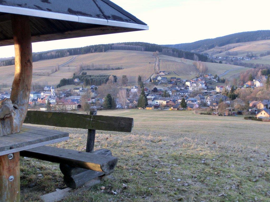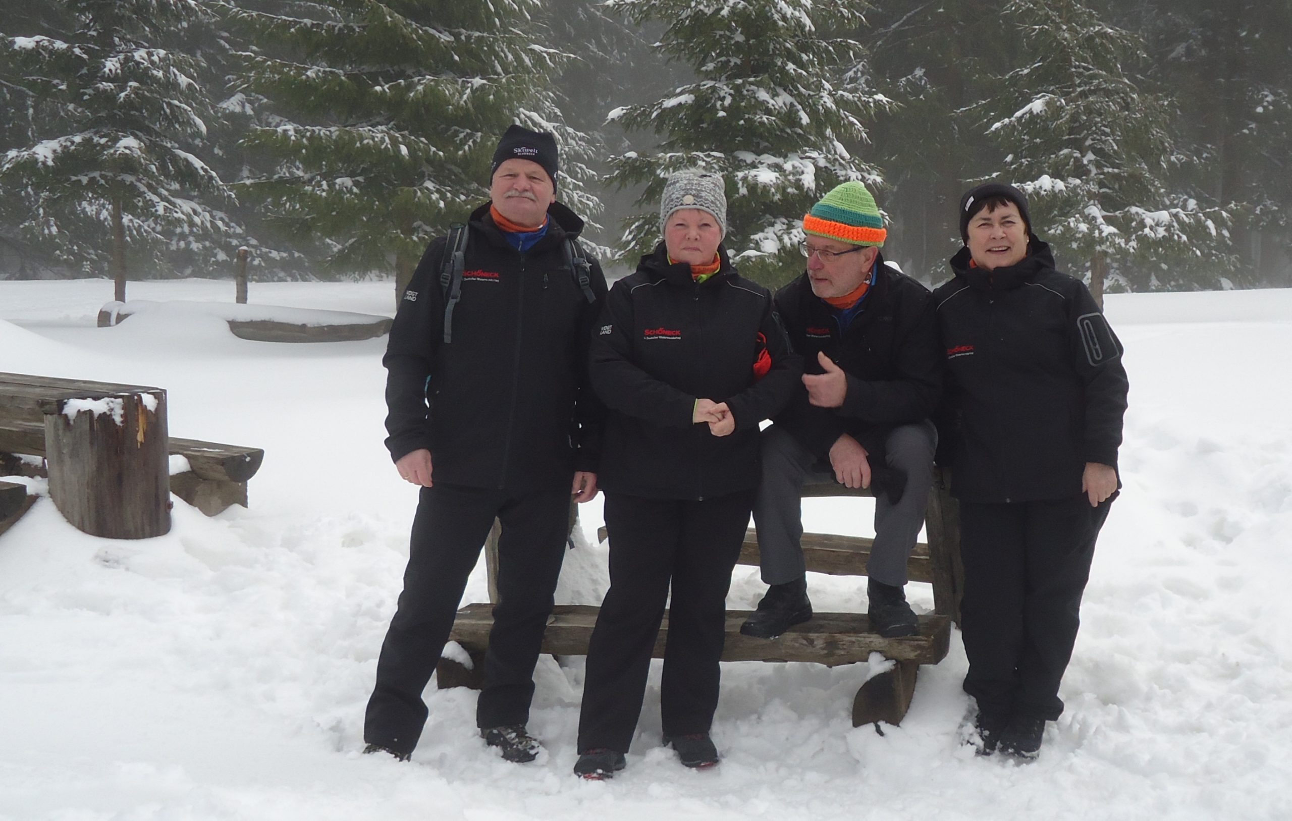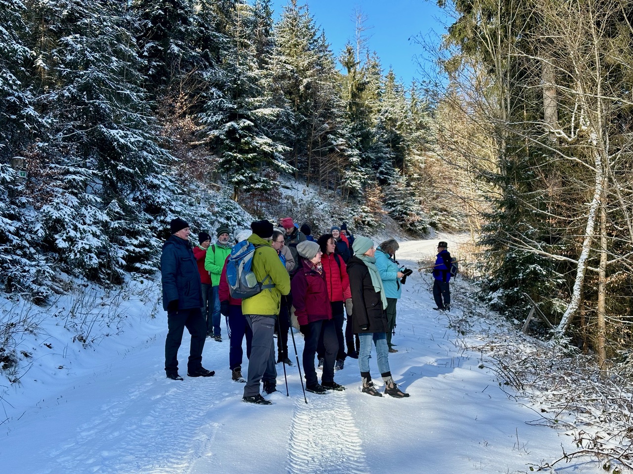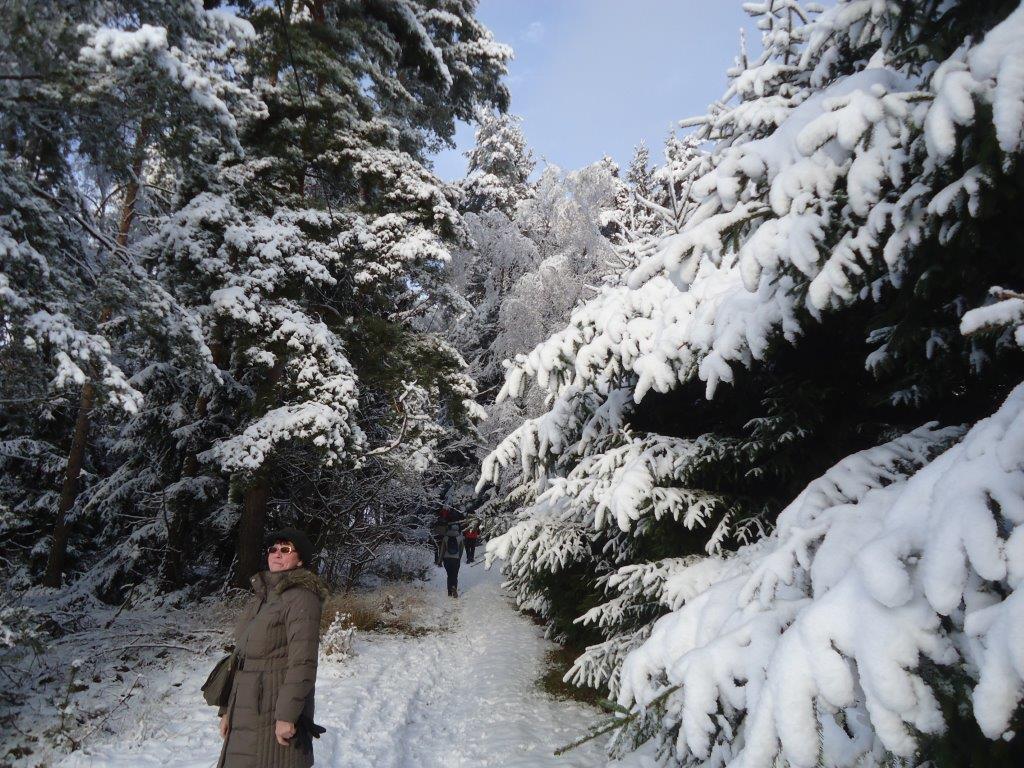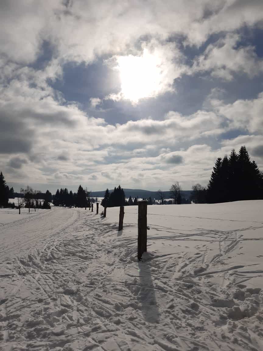 Nach Treff zum Mittagessen im Hotel starteten wir gegen halb zwei. Die eine Gruppe nahm die Wanderschuhe und die andere Gruppe die Skier unter die Füße. Jens und Dolores, Haidrun, Bernd und Rainer unternahmen eine wunderschöne Rundwanderung über etwa 7 km durch die verschiedenen Ortsteile von Neuhammer. An der kleinen Kapelle oben am Waldrand ließen wir unsere Blicke über die tiefverschneite Landschaft schweifen.