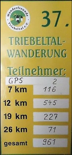 Neben einer geführten Wanderung über sieben Kilometer, an der sich 95 Gäste beteiligten, standen Strecken über 12, 19 und 26 Kilometer bei der 38. Triebeltalwanderung zur Wahl. Mit 332 entschied sich die große Mehrheit für die Zwölf-Kilometer-Tour. 162 Wanderer liefen die 19 Kilometer, immerhin noch 56 die längste Variante über 26.